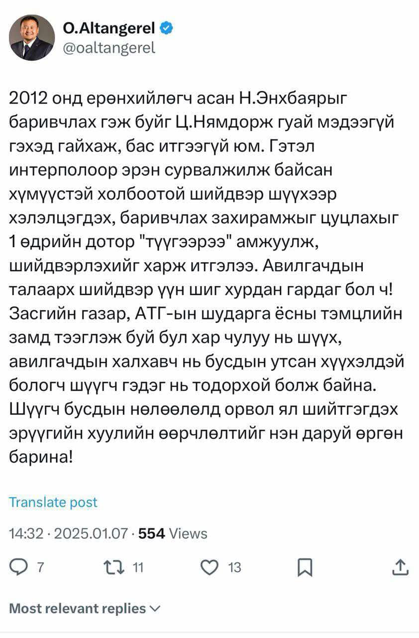 Хууль зүй, дотоод хэргийн сайд О.Алтангэрэл өнөөдөр /2025.01.08/ өөрийн цахим хуудастаа "Шүүгч бусдын нөлөөнд орвол ял шийтгэгдэх эрүүгийн хуулийн өөрчлөлтийг нэн даруй өргөн барина" хэмээн мэдэгджээ.