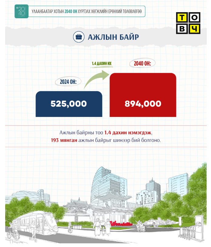 - Улаанбаатар хотын хүн ам 1.6 сая байгаа бол 2040 онд 2.1 сая болж өсөх ба үүний 405 мянган хүн амыг дагуул хотуудад суурьших тооцооллыг мэргэжлийн байгууллагуудаас гаргасан.