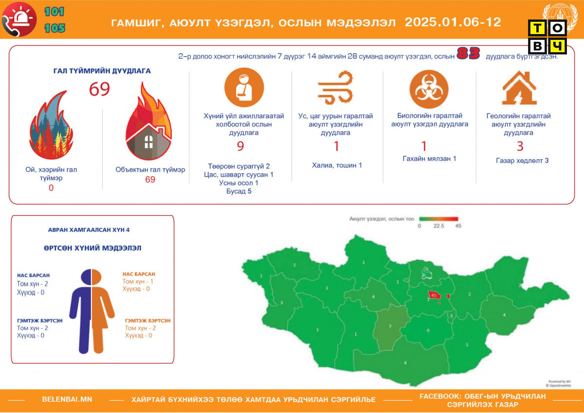 Улсын хэмжээнд өнгөрсөн долоо хоногт /2025.01.06-12/ нийслэлийн 7 дүүрэг, 14 аймгийн 28 суманд аюулт үзэгдэл, ослын 83 удаагийн дуудлага бүртгэгдсэн байна.