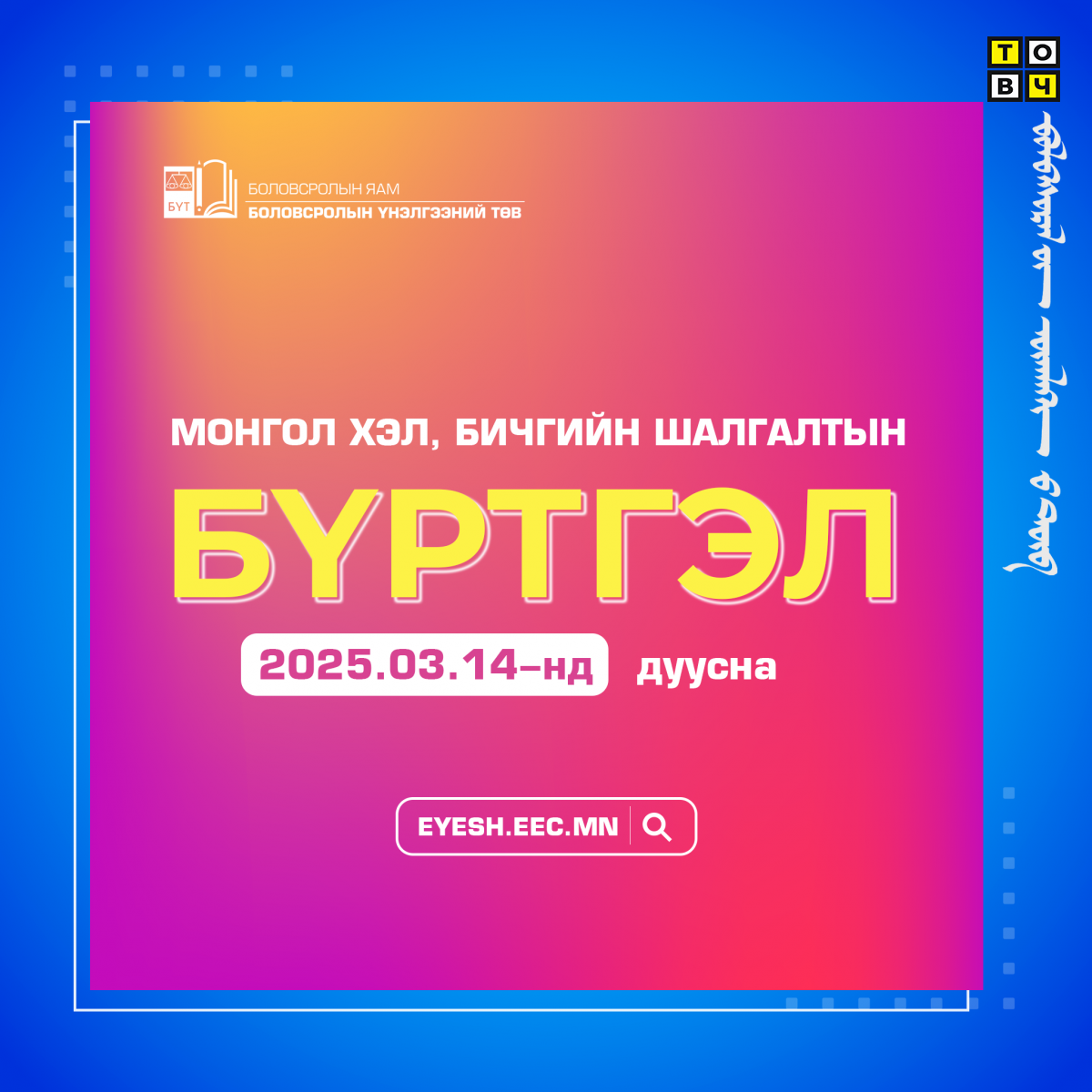 Шалгуулагчид http://eyesh.eec.mn/ сайтаар нэвтрэн орж, хувийн мэдээллээ оруулан шалгалтаа сонгож бүртгэлээ албан ёсоор баталгаажуулна.