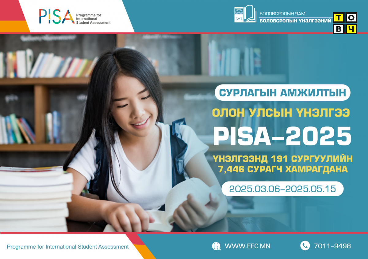 Programme for International Student Assessment /PISA/ буюу сурлагын амжилтын олон улсын үнэлгээнд манай улсын 191 сургуулийн 7,446 сурагч хамрагдана. Уг үнэлгээг 15 настай сурагчдаас авдаг ба нийгэм, эдийн засгийн амьдралд оролцоход шаардагдах мэдлэг, чадвараа хэр эзэмшсэн байна вэ гэдгийг үнэлдэг олон улсын үнэлгээ юм. Сургуулийн орчинд болон бодит амьдралд тохиолдож болох нөхцөлд сурсан мэдлэгээ хэрэглэж байгаа чадварыг үнэлдэг.