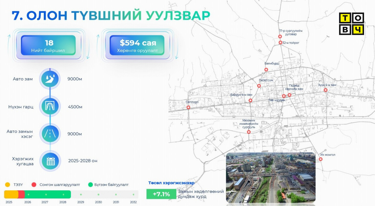 Улаанбаатар хотыг хөгжүүлэх 24 мега төслийн хүрээнд нийслэлийн 18 байршилд олон түвшний уулзвар барина. Тодруулбал, Баруун 4 зам, Саппоро, Механик инженерийн сургууль, Төв шуудан, Гэсэр сүм, Баянбүрд, 32-ын тойрог, 17 дугаар сургуулийн уулзвар, Гадаад хэргийн яам, Төв шуудан, Зүүн 4 зам, Их монгол зэрэг 18 байршилд олон түвшний уулзвар 9000 метр авто зам, 4500 метр нүхэн гарц барихаар төлөвлөөд байна. Төсөл хэрэгжсэнээр замын хөдөлгөөний дундаж хурд 7.1 хувиар нэмэгдэнэ. 2025-2028 он хүртэл төслийг гүйцэтгэнэ.