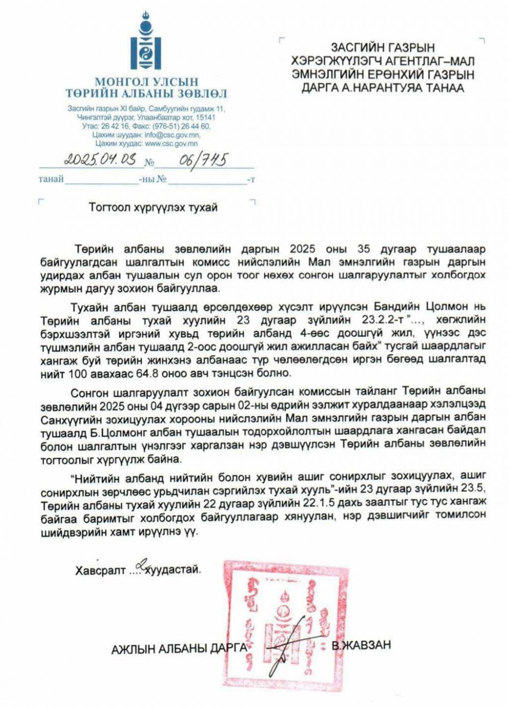2024 оны 11 дүгээр сарын 14, 18-ны өдрүүдэд болсон Нийслэлийн Мал эмнэлгийн газрын даргын албан тушаалын сонгон шалгаруулалтад оролцсон Б.Цолмон гэх эмэгтэйг ТАЗ-ийн Ажлын албаны дарга Б.Жавзан хууль бусаар шалгаруулсан нь баримтаар нотлогдож байна. Тодруулбал, тэрбээр шаардлага хангаагүй нэр дэвшигч Б.Цолмонг шалгалтад оруулж, шалгалтын дараа шаардлагатай материалыг нөхөж бүрдүүлэн, хууль зөрчин томилгоо хийжээ.