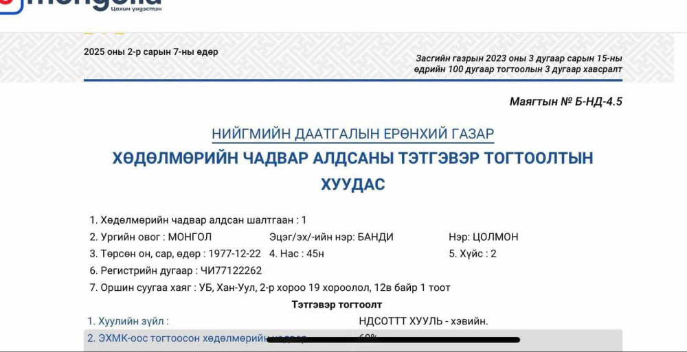 Гэтэл Б.Цолмон энэхүү шаардлагыг хангаагүй төдийгүй, шалгалтын үндсэн материал болох Хөдөлмөрийн чадвар алдсаны тэтгэвэр тогтоолтын хуудсыг шалгалт дууссанаас 3 сарын дараа, 2025 оны 2 дугаар сарын 7-нд нөхөн бүрдүүлсэн нь хууль зөрчсөн ил тод баримт юм.