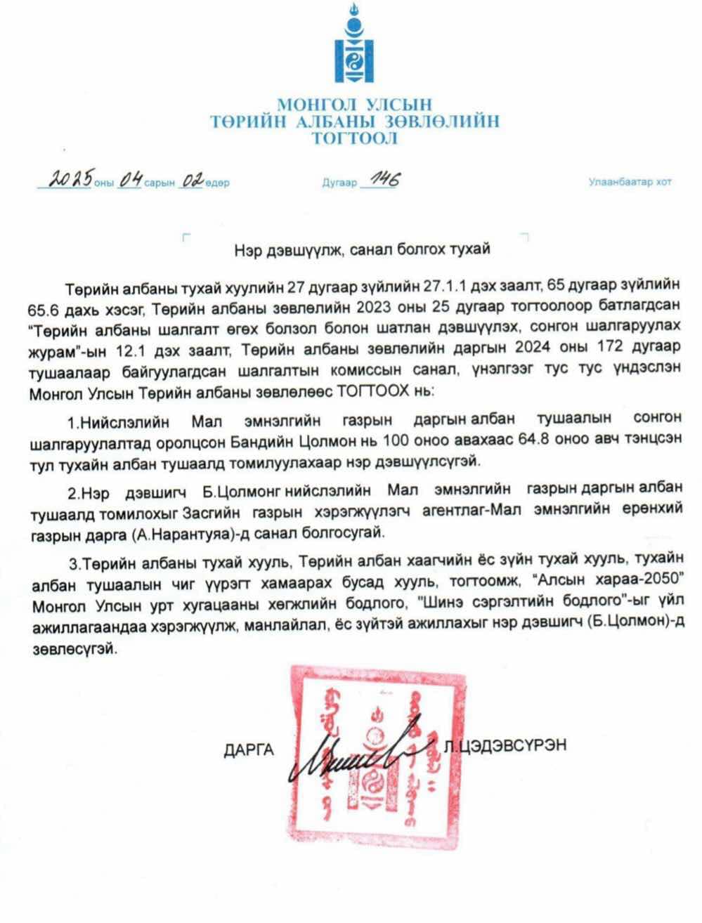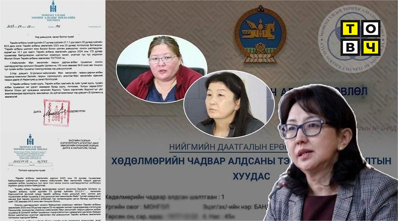 Төрийн албаны зөвлөлийн дарга Л.Цэдэвсүрэн энэхүү илт хууль зөрчсөн, албан тушаал, ашиг сонирхолын зөрчил бүхий томилгоонд яаралтай арга хэмжээ авч, хууль зөрчсөн этгээдүүдэд хариуцлага тооцож чадахгүй бол өөрөө хариуцлага хүлээнэ үү