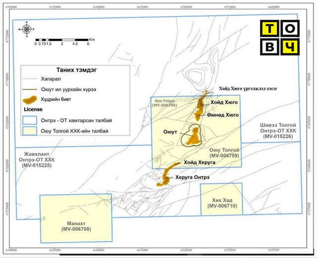 "Онтрэ" компани Оюу толгойн хойд Хюго ордын үзүүр хэсгийн “Шивээ толгой” лицензийн талбай, урд талдаа Херуга ордод “Жавхлант” гэсэн 2 лицензтэй.