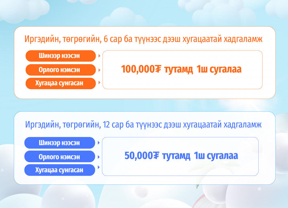 Жишээ нь: Та 6 эсвэл 9 сарын хугацаатай хадгаламжийг 500,000₮-өөр нээлгэсэн тохиолдолд танд “Хадгаламжтай аялал” аяны 5ш сугалаа автоматаар үүснэ. Харин 12 ба түүнээс дээш сарын хугацаатай хадгаламжийг 500,000₮-өөр нээлгэсэн тохиолдолд 10ш сугалаа автоматаар үүснэ.