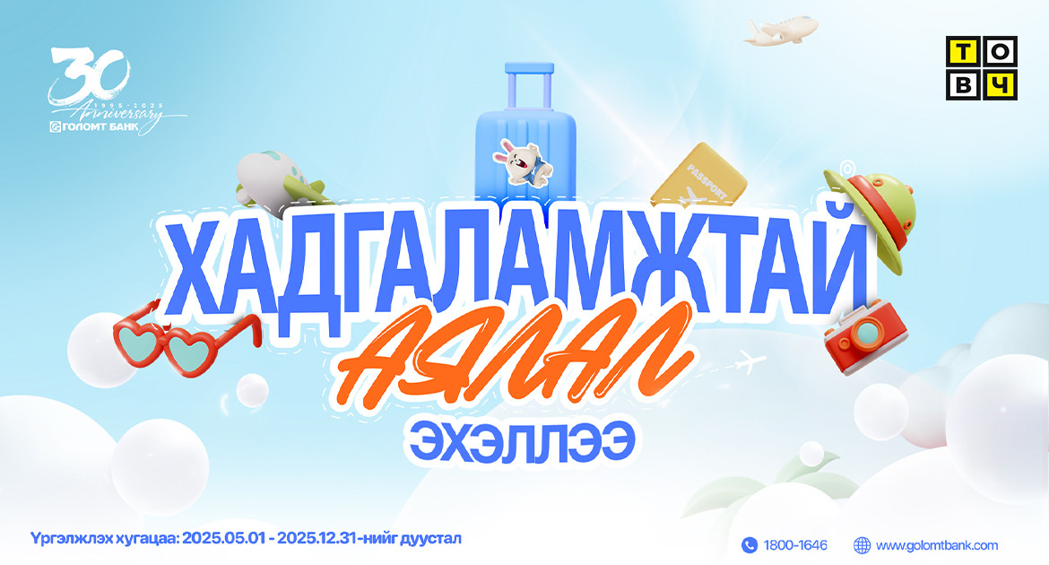 “Хадгаламжтай аялал” урамшуулалт аян нь 2025.05.01-2025.12.31-нийг дуустал үргэлжлэх бөгөөд азтануудыг Golomt Bank фэйсбүүк хуудсаар тухай бүр шууд дамжуулан тодруулна.