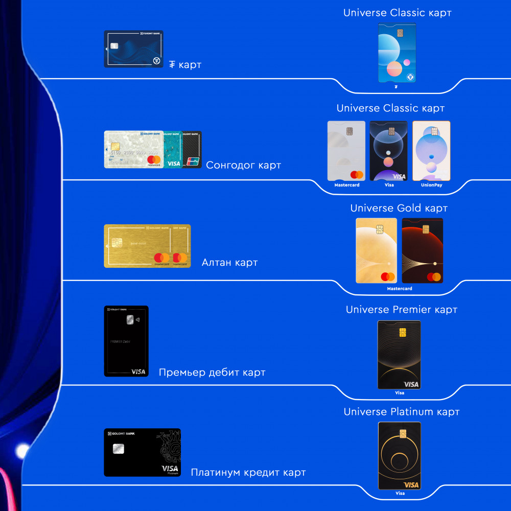 Харилцагч та Голомт банкны Universe картуудаар дэлхийн хаана ч төлбөр тооцоогоо саадгүй хийж, санхүүгийн хил хязгааргүй боломж, эрх чөлөөг мэдрээрэй.
