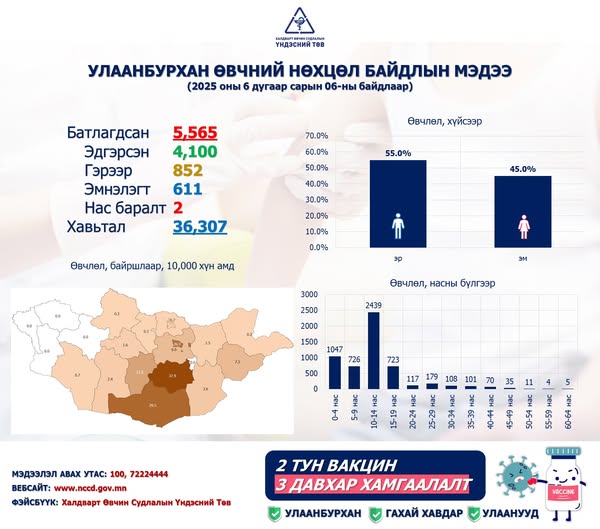 Халдварт өвчин судлалын үндэсний төвөөс улаанбурхан өвчний нөхцөл байдлын талаар мэдээлэл хийлээ. Одоогийн байдлаар улаанбурхан өвчний батлагдсан тохиолдол 5565, эмнэлэгт хэвтэн эмчлүүлж байгаа 611, гэрээр 854, эдгэрсэн 4100 байна.