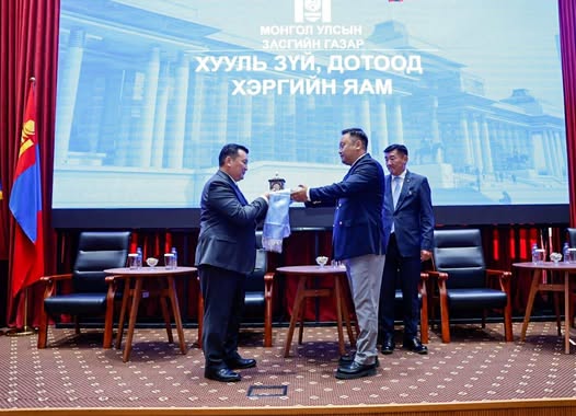 Хууль зүй, дотоод хэргийн сайдаар томилогдсон Л.Мөнхбаатар, Хуульзүй, дотоод хэргийн сайд асан О.Алтангэрэлээс тамгаа гардан авч үүрэгт ажилдаа орлоо.