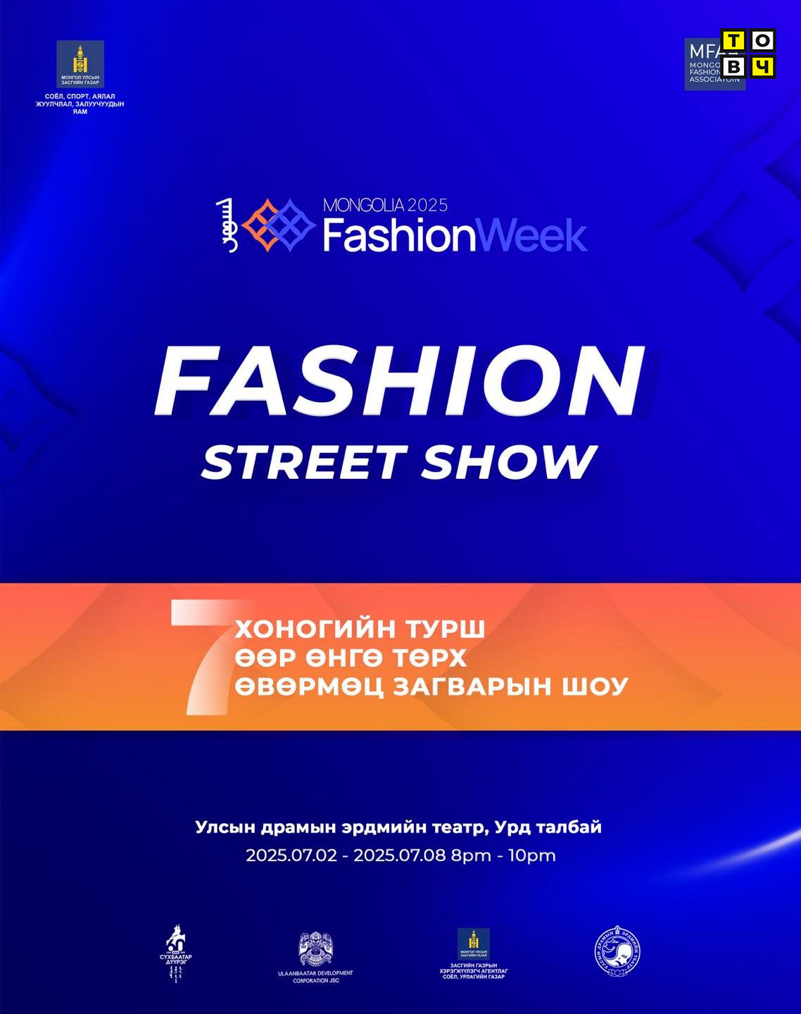 Монголын хувцас загварын салбарын үндэсний хэмжээнд зохион байгуулагдах олон талт үйл ажиллагаанаас бүрдсэн "Mongolia fashion week 2025" арга хэмжээ 07-р сарын 02-наас 07-р сарын 08-ны өдрүүдэд зохион байгуулагдана.