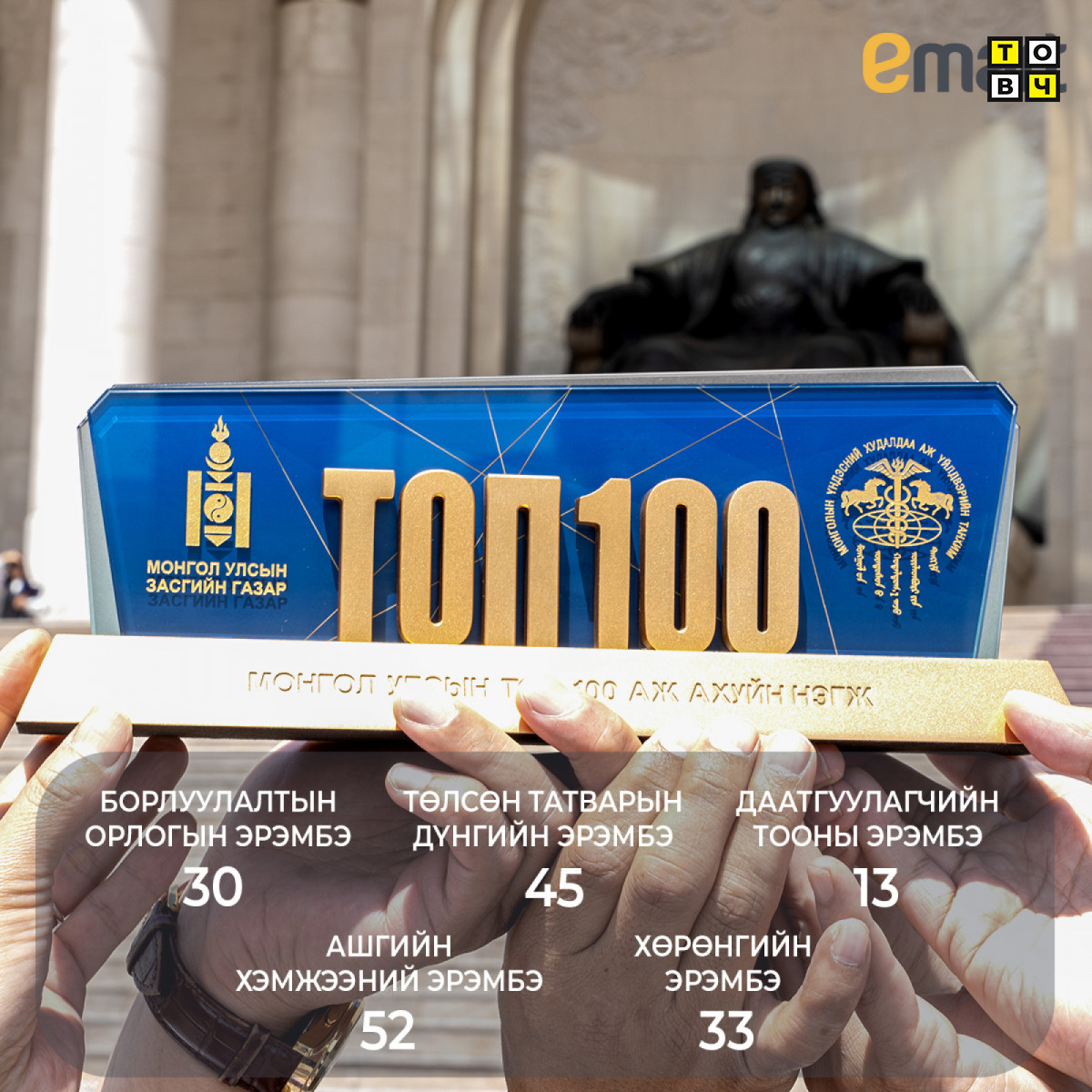 Монгол улсын Засгийн Газар, Монголын Үндэсний Худалдаа Аж Үйлдвэрийн Танхим хамтран эх орныхоо нийгэм, эдийн засгийн хөгжилд үнэтэй хувь нэмэр оруулж буй ‘‘ТОП-100’’ ААН-ийг жил бүр тодруулдаг уламжлалтай билээ.