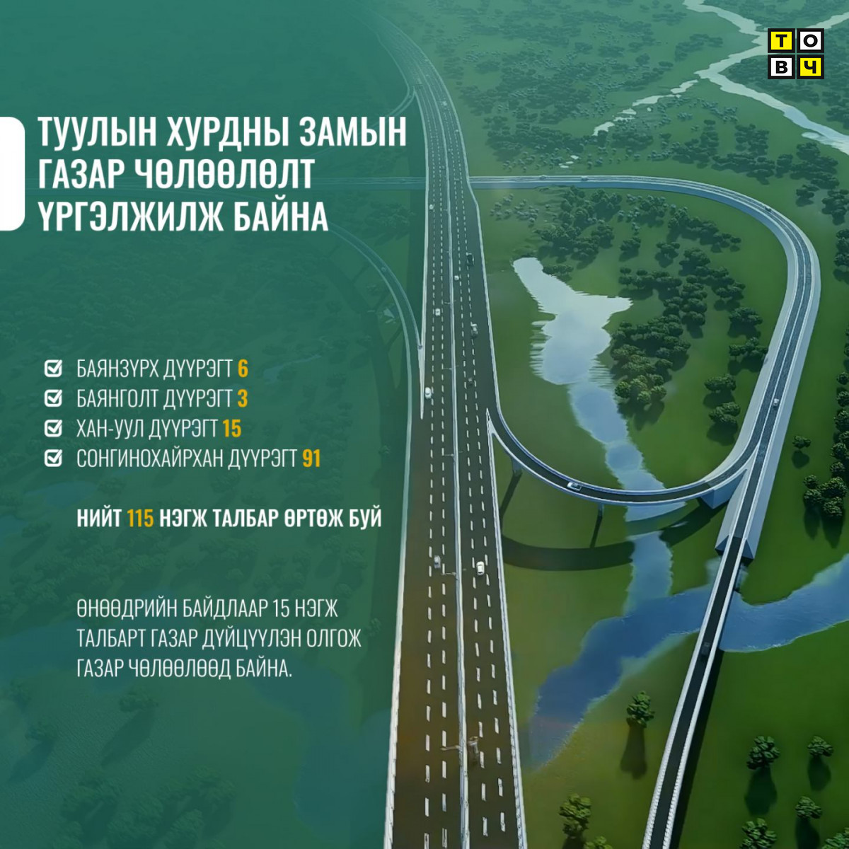 Туулын хурдны зам болон тус замын үерийн байгууламжийн нөлөөлөлд Баянзүрх дүүрэг дүүргийн нутаг дэвсгэрт 6, Баянгол дүүргийн нутаг дэвсгэрт 3, Хан-Уул дүүргийн нутаг дэвсгэрт 15, Сонгинохайрхан дүүргийн нутаг дэвсгэрт 91 нийт 115 нэгж талбар өртөж буй. Өнөөдрийн байдлаар 15 нэгж талбарт газар дүйцүүлэн олгож газар чөлөөлөөд байна. Үлдсэн 100 нэгж талбартай зөвшилцөх ажил үргэлжилж байна.