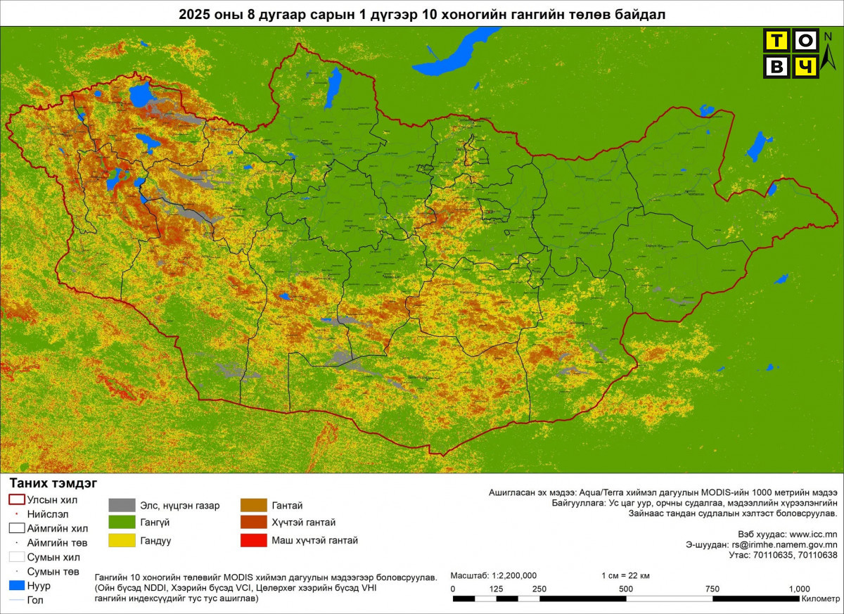 Ус цаг уур, орчны судалгаа, мэдээллийн хүрээлэнгийн Зайнаас тандан судлалын хэлтсээс Aqua хиймэл дагуулын MODIS-ын мэдээгээр гангийн төлөв байдлыг орон зайн өндөр нарийвчлалтайгаар үнэлсэн байна.