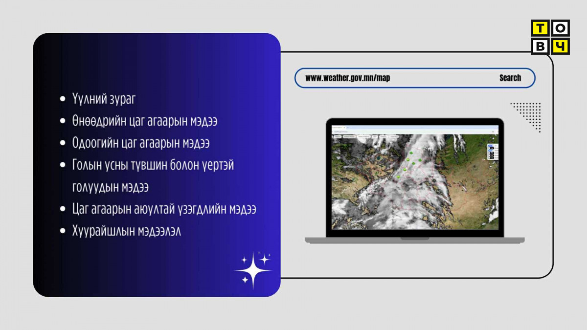 Цаг уур, орчны шинжилгээний газраас иргэд, аж ахуйн нэгжүүдэд хүргэдэг мэдээлэл, үйлчилгээний чанар, хүртээмжийг нэмэгдүүлэх зорилгоор шинэ бүтээгдэхүүн нэвтрүүлснээ танилцуулж байна.
