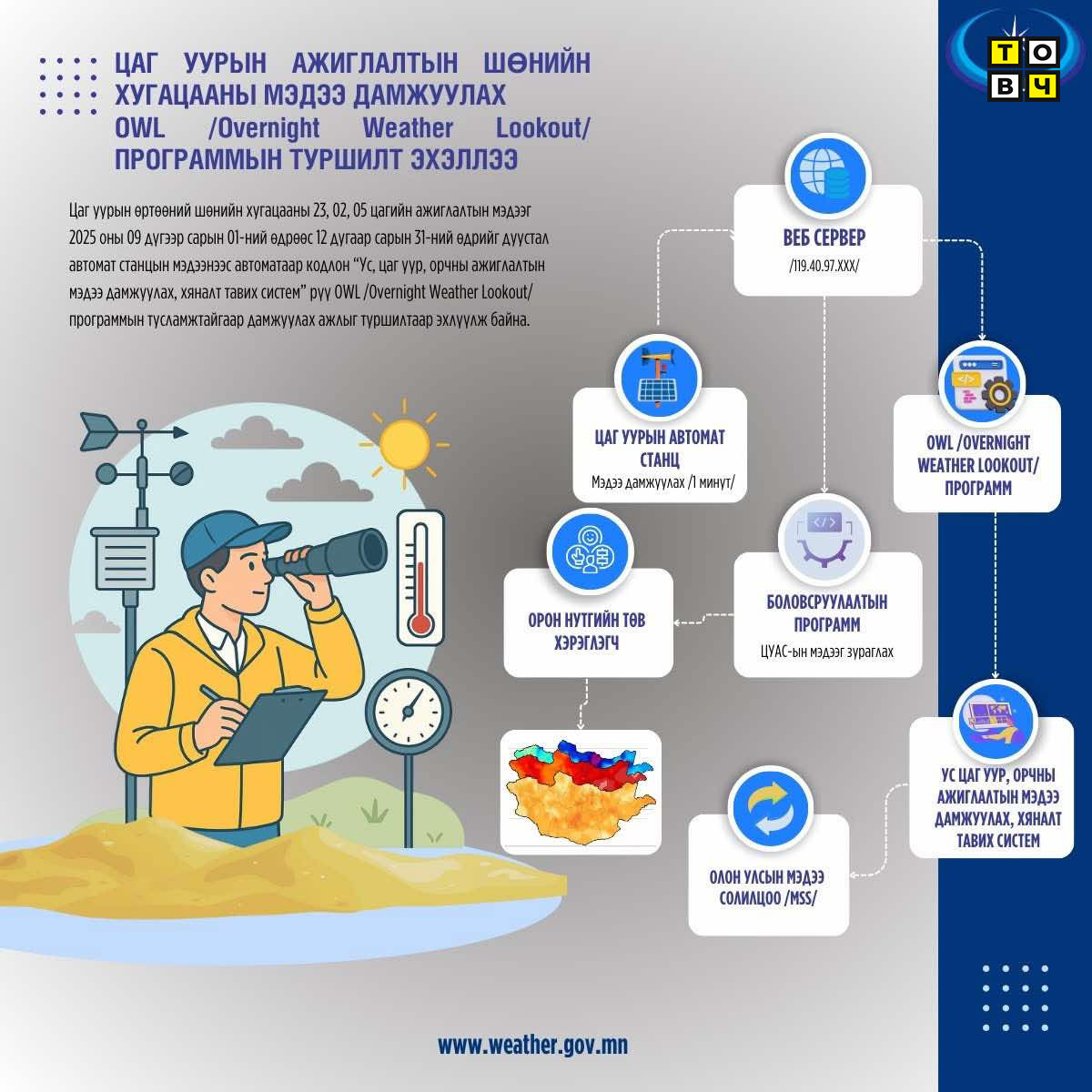 Цаг уур, орчны шинжилгээний газар 2025 оны 9-р сарын 01-нээс OWL буюу "Overnight Weather Lookout" программыг цаг уурын 3 өртөөнд туршилтаар нэвтрүүлэхэд бэлэн боллоо. Энэхүү программ нь цаг уурчдын шөнийн 23:00, 02:00, 05:00 цагийн ажиглалтын мэдээг автоматаар коодлон дамжуулах бөгөөд ажиллагсдын шөнийн ачааллыг бууруулах, эрүүл мэндийг хамгаалах ач холбогдолтой. Зарим цаг уурын үзэгдлийг зөвхөн нүдэн баримжаагаар нарийн тодорхойлох шаардлага хэвээр байгаа тул хүн ба автомат системийн хосолсон шийдлийг хэрэгжүүлж байна. Туршилтын үр дүнг үнэлсний үндсэн дээр аль аль байршилд хэрхэн ашиглахыг шийдвэрлэх юм. OWL программ нь тус газарт шинээр байгуулсан Технологи, инновацын хэлтсийн ээлжит бүтээгдэхүүн юм.