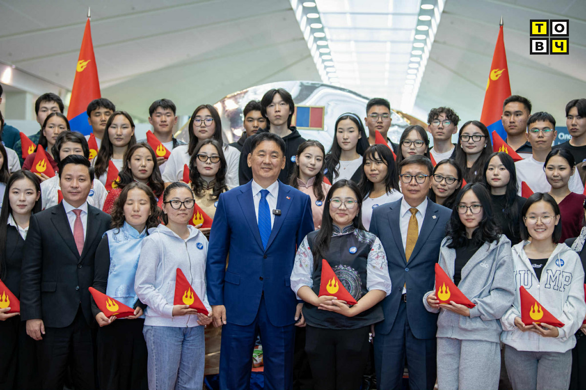 Монгол Улсын Ерөнхийлөгч Ухнаагийн Хүрэлсүх оюутан залуусыг үдэх ёслолд оролцож, сурлагын өндөр амжилт хүсэн Төрийн далбаа дурсгалаа.