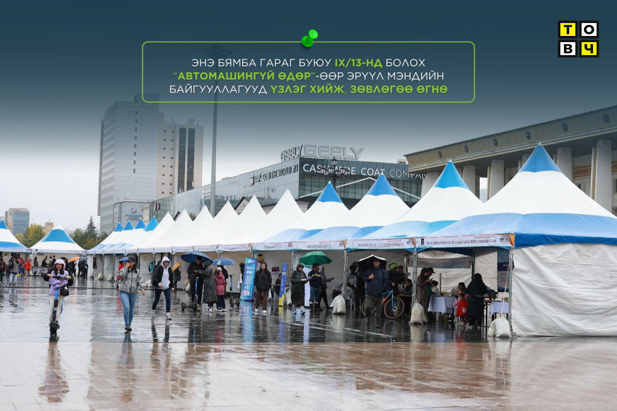 Энэ бямба гарагт “Автомашингүй өдөр-2025” арга хэмжээг “Эрсдэлгүй-эрүүл орчныг хамтдаа” уриан дор зохион байгуулна. Автомашингүй өдрөөр соёл, урлагийн тоглолт, спортын арга хэмжээ зохион байгуулагдана. Мөн НЭМГ-ын харьяа байгууллагууд, хувийн хэвшлийн эрүүл мэндийн байгууллагууд амны хөндийн эрүүл мэндийн үзлэг, чихрийн шижингийн илрүүлэг, цусны даралт ихсэх өвчний зөвлөгөө, сүрьеэгийн илрүүлэг, дасгал хөдөлгөөний зөвлөгөө, эрүүл хооллолтын зөвлөмж мэдээлэл өгөх юм.