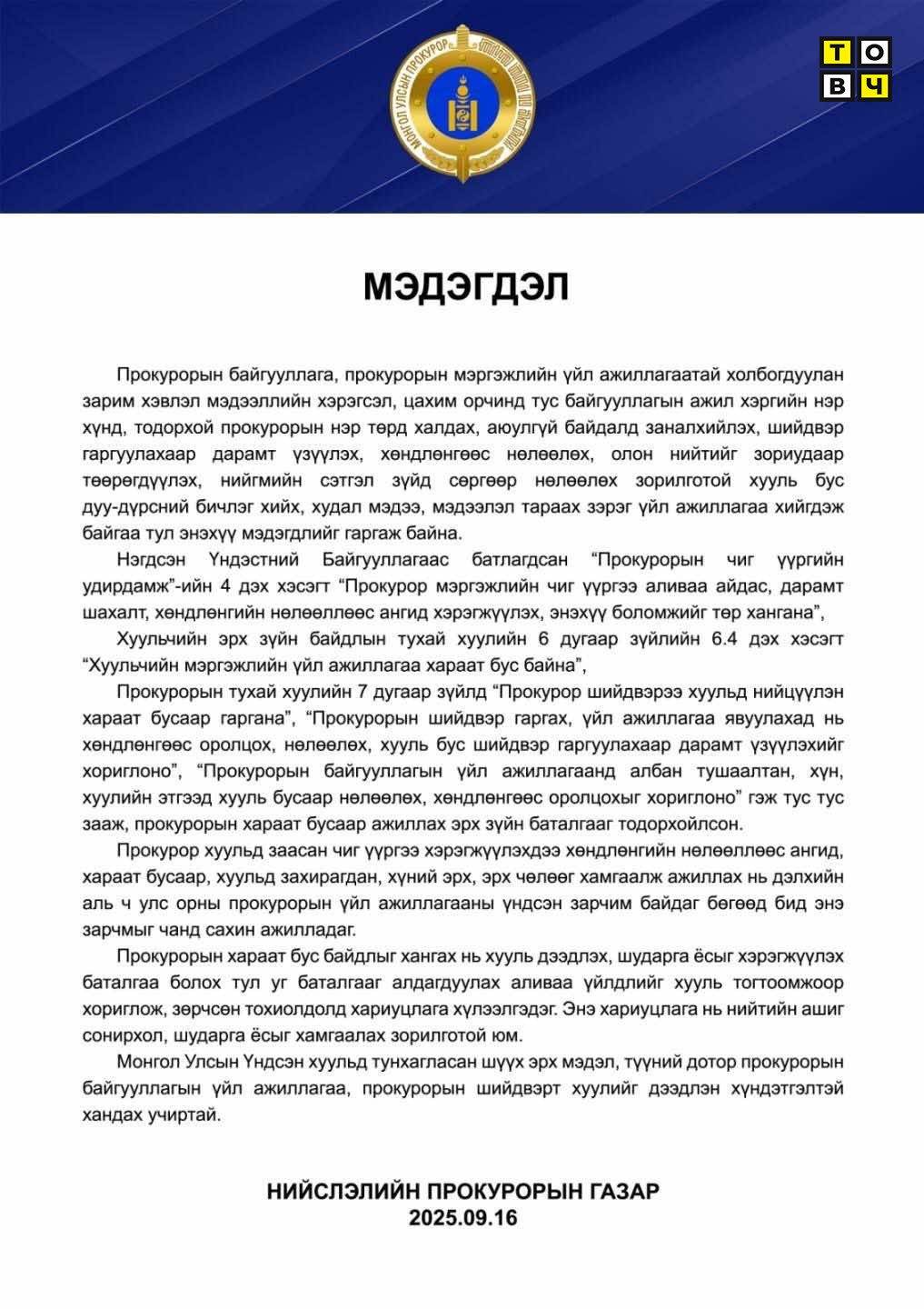 "Прокурорын байгууллага, прокурорын мэргэжлийн үйл ажиллагаатай холбогдуулан зарим хэвлэл мэдээллийн хэрэгсэл, цахим орчинд тус байгууллагын ажил хэргийн нэр хүнд, тодорхой прокурорын нэр төрд халдах, аюулгүй байдалд заналхийлэх, шийдвэр гаргуулахаар дарамт үзүүлэх, хөндлөнгөөс нөлөөлөх, олон нийтийг зориудаар төөрөгдүүлэх, нийгмийн сэтгэл зүйд сөргөөр нөлөөлөх зорилготой хууль бус дуудлага, бичлэг хийх, худал мэдээ, мэдээлэл тараах зэрэг үйл ажиллагаа хийгдэж байгаа тул энэхүү мэдэгдлийг гаргаж байна.