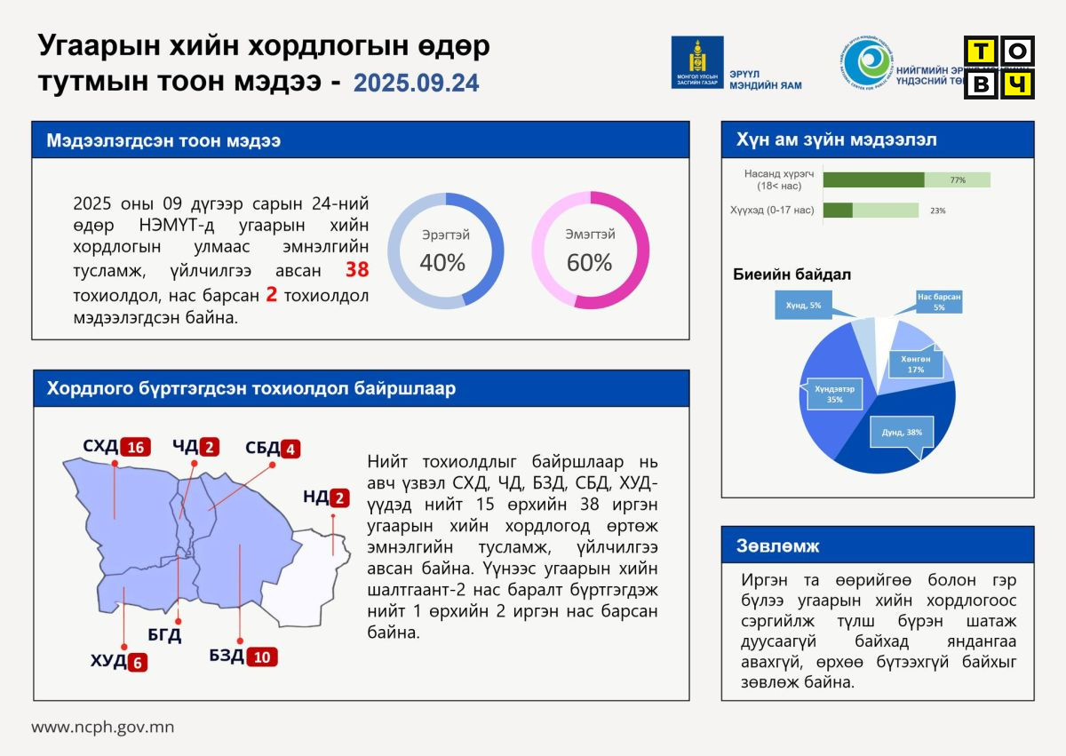 НЭМҮТ-өөс угаарын хийн хордлогын мэдээллийг гаргажээ. Тодруулбал, энэ сарын 24-нд буюу өчигдөр НЭМҮТ-д угаарын хийн хордлогын улмаас 38 иргэн эмнэлгийн тусламж үйлчилгээ авсан байна. Мөн 2 хүн угаартаж нас барсан байна.