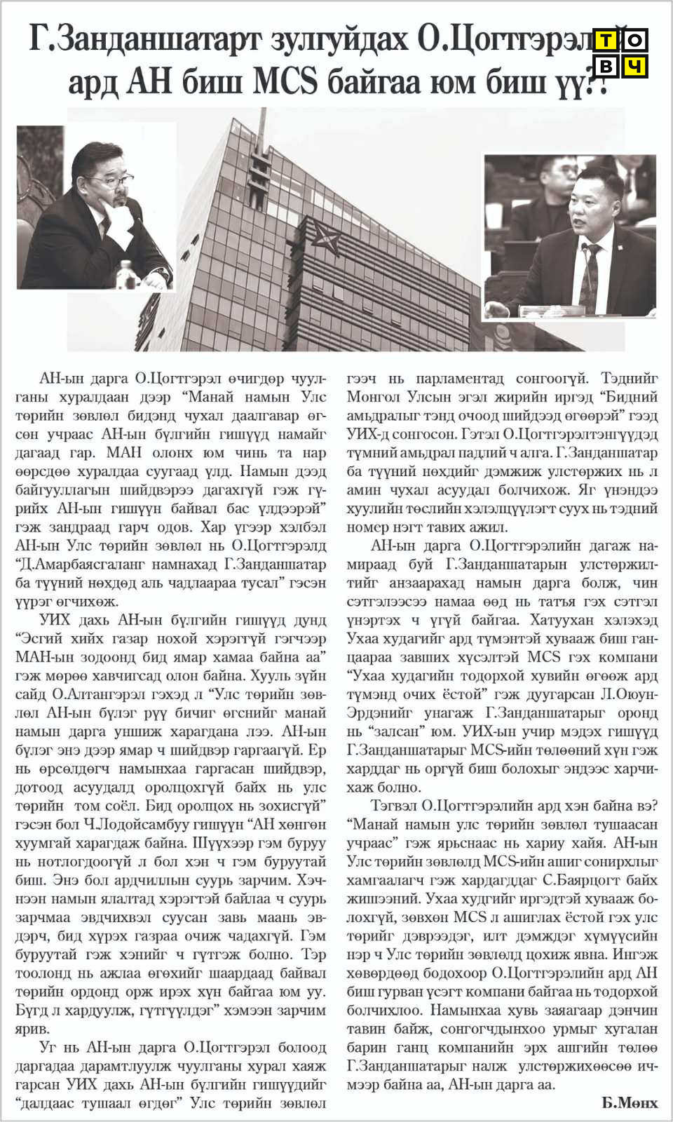 Тэгвэл О.Цогтгэрэлийн ард хэн байна вэ? “Манай намын улстөрийн зөвлөл тушаасан учраас” гэж ярьнаас нь хариу хайя. АН-ын Улстөрийн зөвлөлд MCS-ийн ашиг сонирхлыг хамгаалагч гэж хардагддаг С.Баярцогт байх жишээний. Ухаа худгийг иргэдтэй хувааж болохгүй, зөвхөн MCS л ашиглах ёстой гэх улстөрийг дэврээдэг, илт дэмждэг хүмүүсийн нэр ч Улстөрийн зөвлөлд цохиж явна. Ингэж хөвөрдөөд бодохоор О.Цогтгэрэлийн ард АН биш гурван үсэгт компани байгаа нь тодорхой болчихлоо. Намынхаа хувь заяагаар дэнчин тавин байж, сонгогчдынхоо урмыг хугалан барин ганц компанийн эрх ашгийн төлөө Г.Занданшатарыг налж улстөржихөөсөө ичмээр байна аа, АН-ын дарга аа.