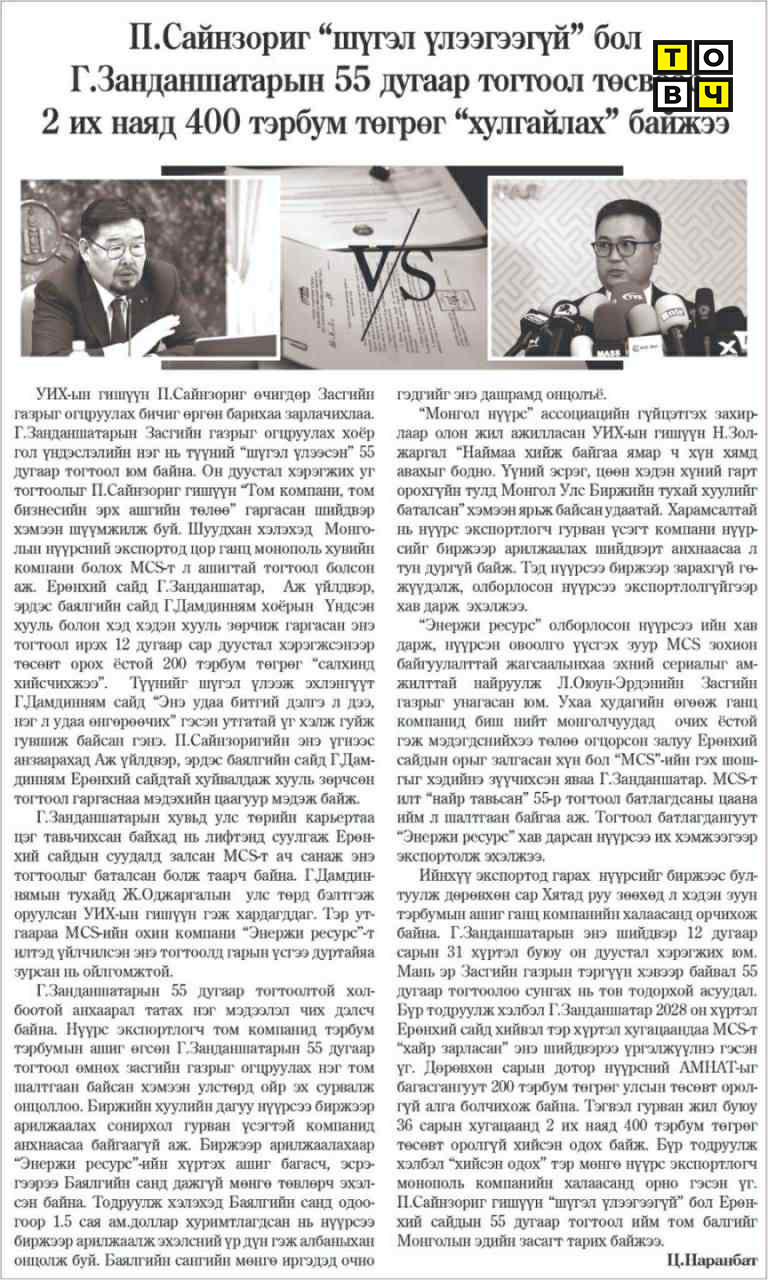 “Энержи ресурс” олборлосон нүүрсээ ийн хав дарж, нүүрсэн овоолго үүсгэх зуур MCS зохион байгуулалттай жагсаалынхаа эхний сериалыг амжилттай найруулж Л.Оюун-Эрдэнийн Засгийн газрыг унагасан юм. Ухаа худагийн өгөөж ганц компанид биш нийт монголчуудад очих ёстой гэж мэдэгдснийхээ төлөө огцорсон залуу Ерөнхий сайдын орыг залгасан хүн бол “MCS”-ийн гэх шошгыг хэдийнэ зүүчихсэн яваа Г.Занданшатар. MCS-т илт “найр тавьсан” 55-р тогтоол батлагдсаны цаана ийм л шалтгаан байгаа аж. Тогтоол батлагдангуут “Энержи ресурс” хав дарсан нүүрсээ их хэмжээгээр экспортолж эхэлжээ.