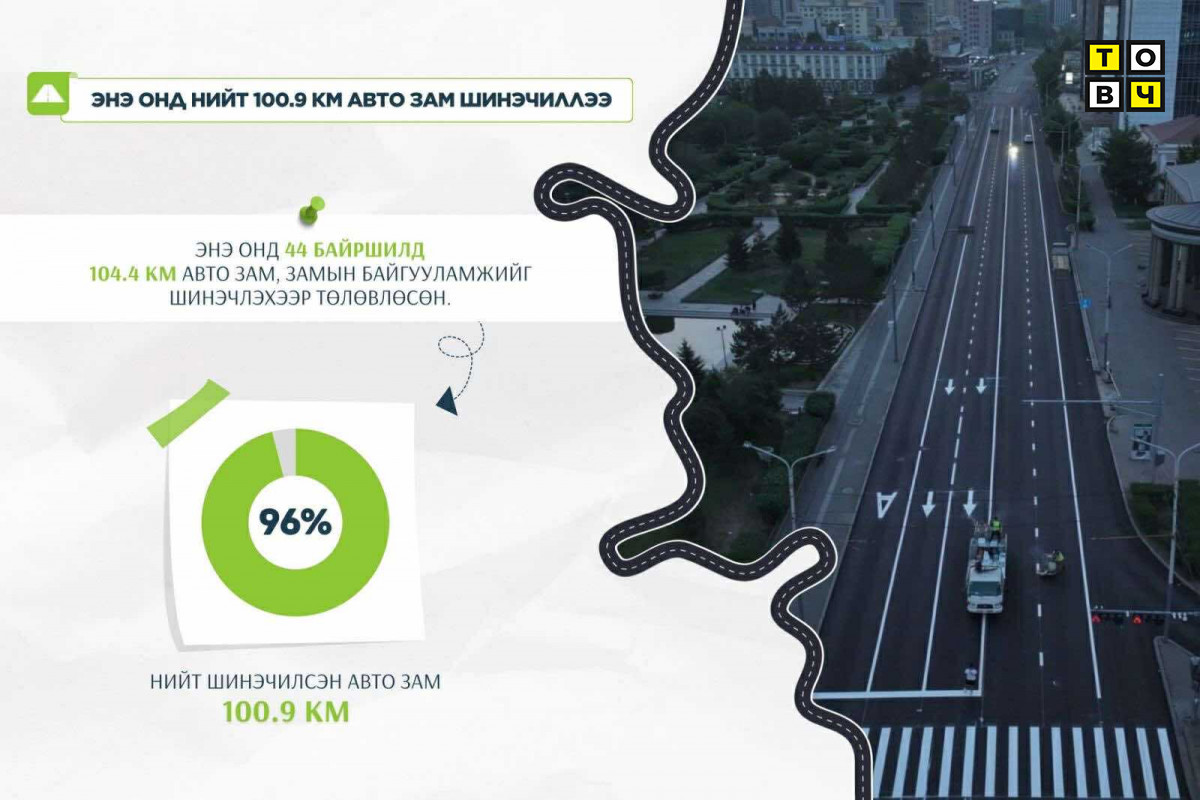 2025 онд нийт 44 байршилд 104.4 км авто зам, замын байгууламжийг шинэчлэхээр төлөвлөсөн. Өнөөдрийн байдлаар 100.9 км авто замыг шинэчилж, нийт авто замын ажлын гүйцэтгэл 96 хувьтай үргэлжилж байна. Энэ жилийн хувьд 1978 оноос хойш их засвар хийгээгүй 16 км Найрамдлын авто зам, 2008 оноос хойш их засвар хийгээгүй 8.9 км Энхтайваны өргөн чөлөөний авто замыг бүрэн шинэчиллээ. Өмнө нь Улаанбаатар хотод ихэвчлэн туслах гудамж замуудад авто замын шинэчлэл хийгдэж байсан бол сүүлийн хоёр жилд гол гудамж замуудаа шинэчлээд зогсохгүй зуслангийн замуудад шинэчлэл үргэлжилж байна.