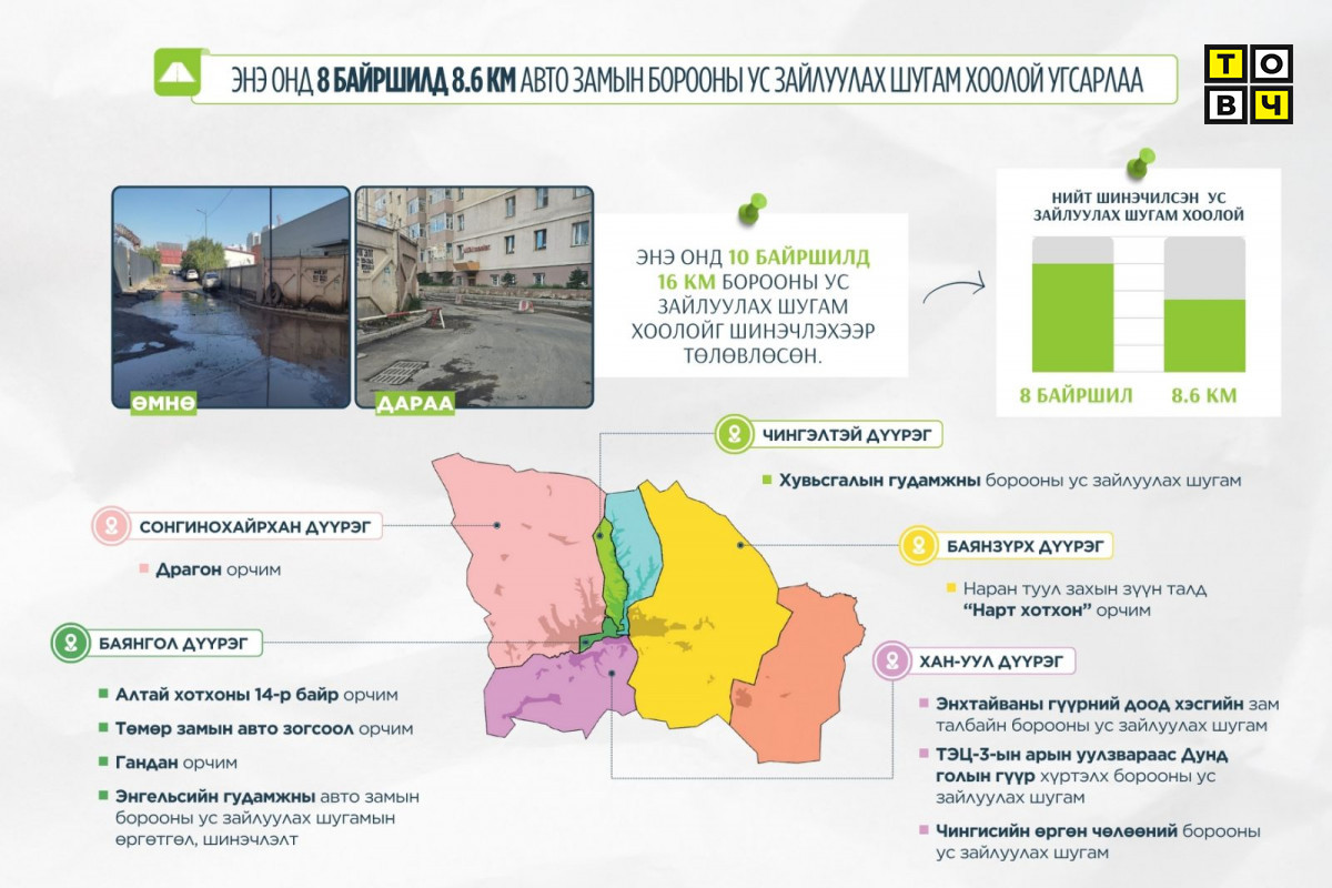 Улаанбаатар хот 1260 гаруй км хатуу хучилттай авто замтай. Гэтэл үүний ердөө 23.6 хувь нь буюу 300 км орчим нь л борооны ус зайлуулах шугамтай. Тэгвэл сүүлийн хоёр жилийн хугацаанд буюу 2024, 2025 онд нийт 40 км орчим борооны ус зайлуулах шугам хоолойг шинээр угсраад байна. Тодруулбал, 2024 онд ус ихээр тогтдог 15 байршилд 27 км авто замын борооны ус зайлуулах шугам угсарсан бол 2025 онд 10 байршилд 16 км борооны ус зайлуулах шугам угсрахаар төлөвлөсөн юм. Өнөөдрийн байдлаар найман байршилд 8.6 км авто замын борооны ус зайлуулах шугам хоолойг угсраад байна.