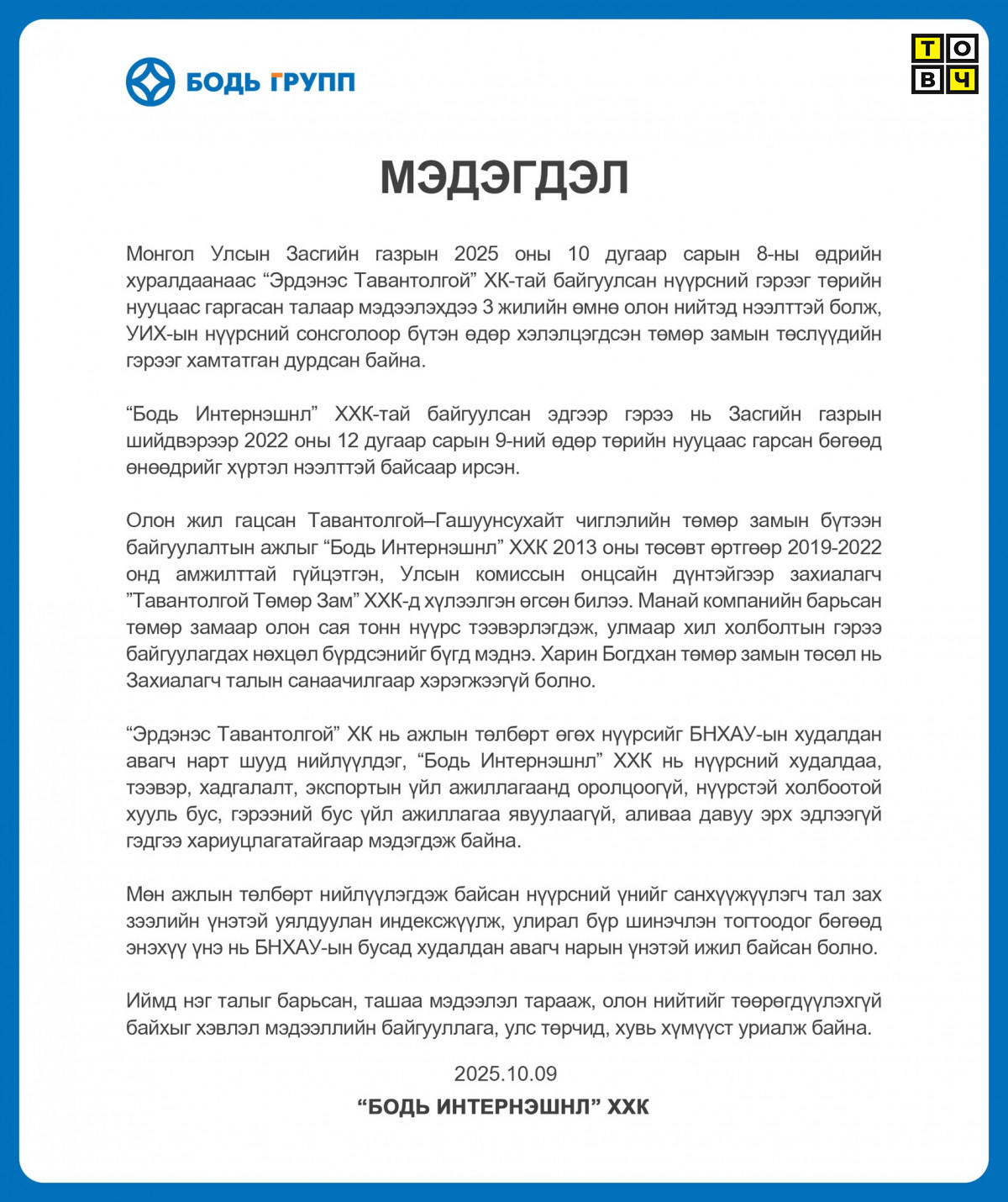 “Эрдэнэс Тавантолгой” ХК нь ажлын төлбөрт өгөх нүүрсийг БНХАУ-ын худалдан авагч нарт шууд нийлүүлдэг, “Бодь Интернэшнл” ХХК нь нүүрсний худалдаа, тээвэр, хадгалалт, экспортын үйл ажиллагаанд оролцоогүй, нүүрстэй холбоотой хууль бус, гэрээний бус үйл ажиллагаа явуулаагүй, аливаа давуу эрх эдлээгүй гэдгээ хариуцлагатайгаар мэдэгдэж байна.