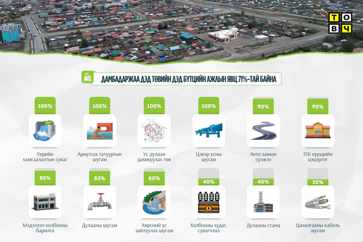 Мөн хөрсний ус зайлуулах ажил 80 хувьтай байна. 2.8 км авто зам барьсан. Өнөөдрийн байдлаар дулааны шугам сүлжээ татах, ус дамжуулах шугам сүлжээ барих ажлыг хийж байна. Барилгажилтын төслийн дагуу айл өрхүүдийн газрыг нөхөн олговортойгоор чөлөөлж, чөлөөлсөн 70 га газарт амины орон сууц барих төсөлд хувийн хэвшлийнхнийг татаж оруулахаар төлөвлөж байна. Сэлбэ голын эрэгт төвийн дулаанд холбогдсон хаус хорооллуудтай болно. Ирэх жилээс газар чөлөөлөлтийн ажлыг хийж, гүйцэтгэгчдийг сонгон шалгаруулна. Сэлбийн даланг 1966 оны үерээс хойш аж ахуйн аргаар хийж босгосон.