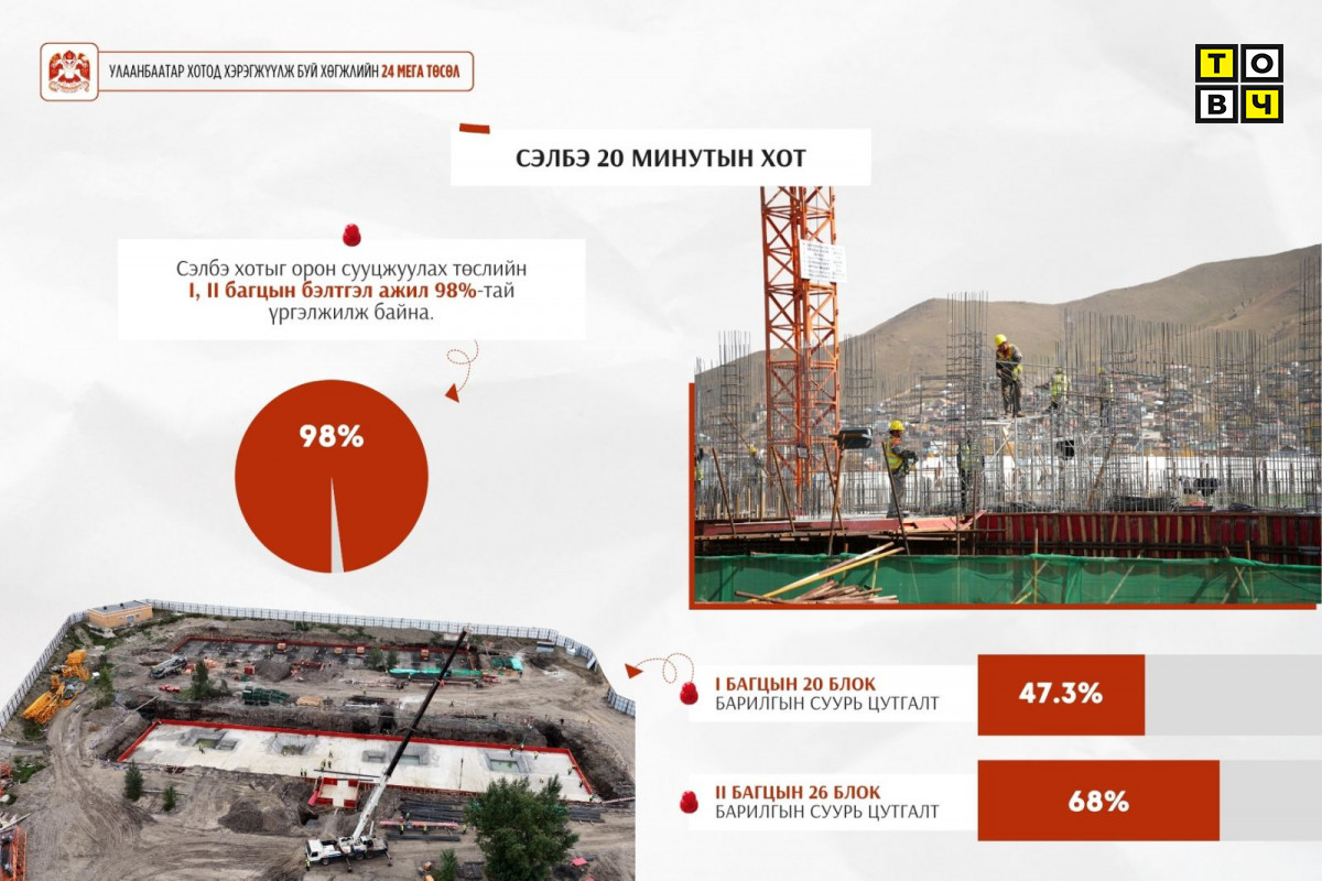 - Мөн багц нэгийн 1786 айлын 20 блок орон сууцны барилгын суурь цутгалтын ажил 47.3 хувь, багц хоёрын 2028 айлын 26 блокийн суурь цутгалтын ажил 68 хувьтай тус тус үргэлжилж байна.