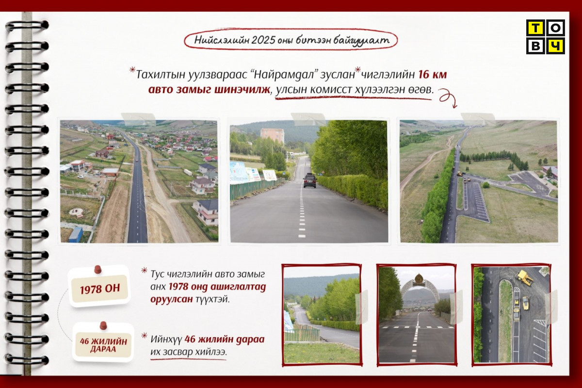 Сонгинохайрхан дүүргийн 22, 34 дүгээр хороо, Тахилтын уулзвараас “Найрамдал” зуслан чиглэлийн 16 км урт, хоёр эгнээ бүхий авто замыг бүрэн шинэчилж, улсын комисст хүлээлгэн өгөөд байна. Тодруулбал, 2024 оны есдүгээр сараас тус авто замыг шинэчилж эхэлсэн бөгөөд өнгөрсөн онд 4 км авто замыг шинэчилсэн юм.