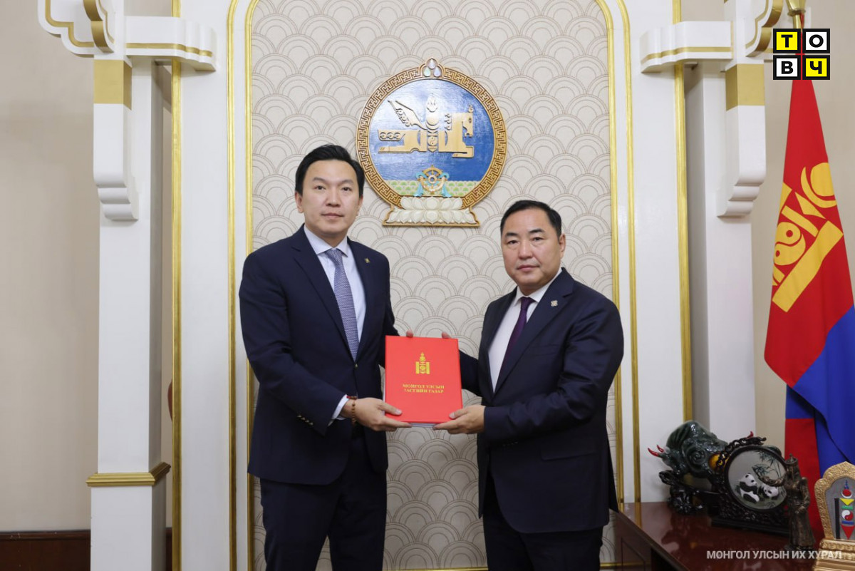 Монгол Улсын Их Хурлын дэд дарга Б.Пүрэвдоржид өнөөдөр (2025.10.30) Улсын Их Хурлын гишүүн, Засгийн газрын гишүүн, Монгол Улсын Тэргүүн шадар сайд бөгөөд Эдийн засаг, хөгжлийн сайд Н.Учрал “Монгол Улсыг 2026-2030 онд хөгжүүлэх таван жилийн үндсэн чиглэл батлах тухай” Улсын Их Хурлын тогтоолын төслийг өргөн мэдүүллээ.