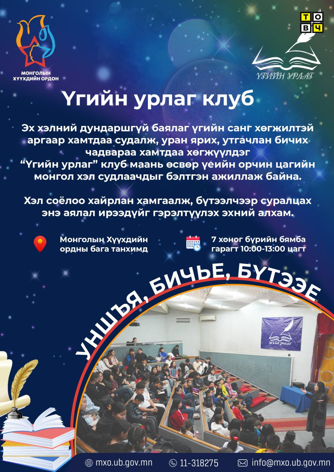 Монголын хүүхдийн ордны дэргэдэх “Үгийн урлаг” клуб энэ оны гуравдугаар сарын 15-наас хүүхэд, багачуудад зориулан үнэ төлбөргүй сургалт явуулж эхэлсэн. Энэхүү сургалт нь хүүхдүүдийн унших, бичих, сэтгэн бодох, бүтээлч сэтгэлгээг хөгжүүлэх болон үгийн баялаг, найруулгын ур чадварыг дээшлүүлэх зорилготой юм.