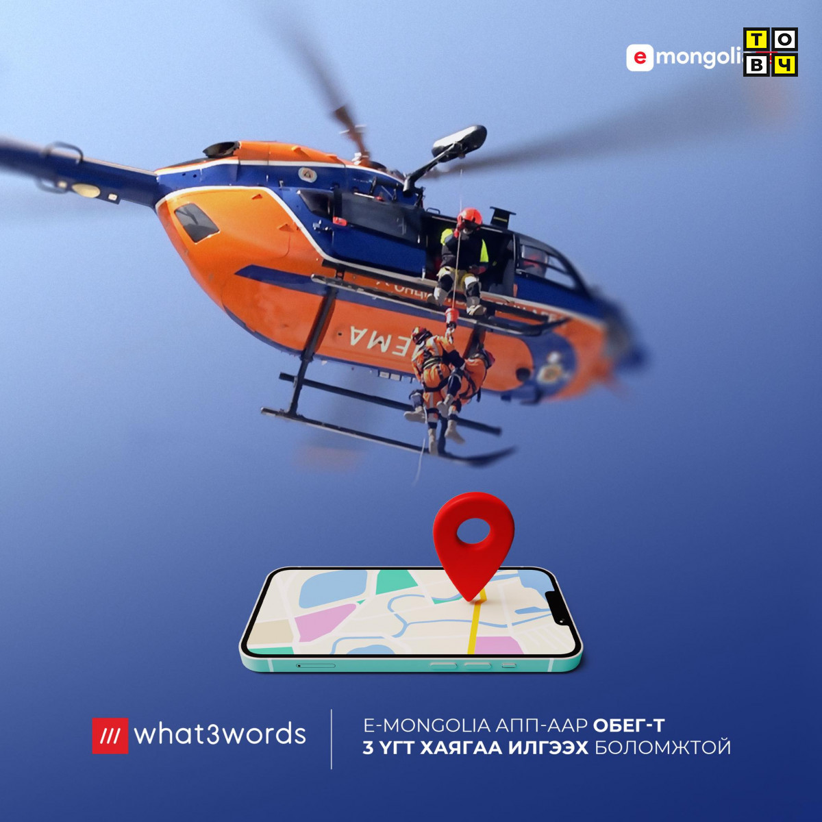 Онцгой байдлын байгууллага нь “what3words” программыг ашиглан, аюул, ослын дуудлагыг иргэдээс 3 үгт хаяг буюу what3words апплейкшнаар авч, байршлыг цаг алдалгүй тогтоож, эрлийн ажиллагааг шуурхай зохион байгуулж байна.