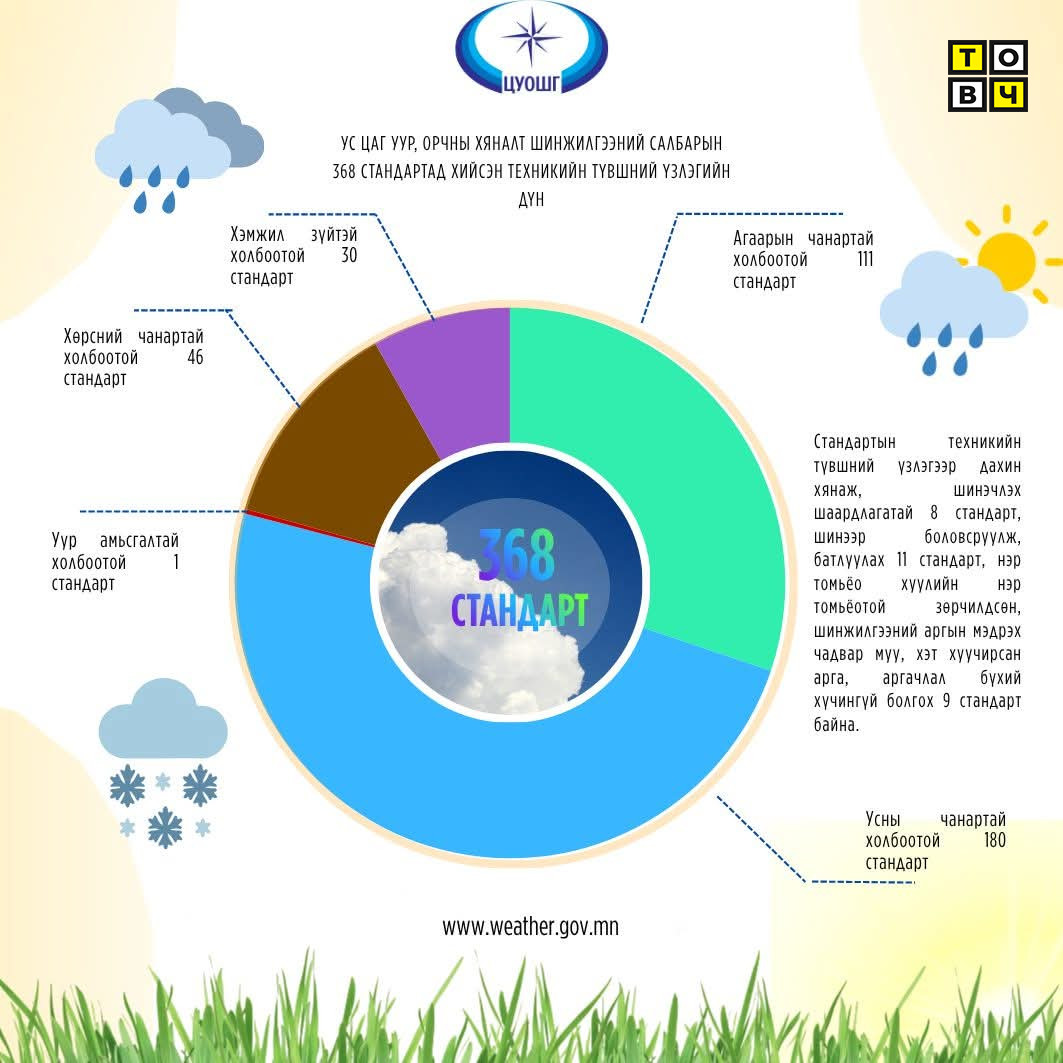 Цаг уур, орчны шинжилгээний газрын даргын 2025 оны А/145 дугаар тушаалаар байгуулагдсан Ажлын хэсэг ус цаг уур, орчны хяналт шинжилгээний салбарын стандартуудад техникийн түвшний үзлэгийг 4 сарын хугацаанд хийж гүйцэтгэлээ.Ус цаг уур, орчны хяналт шинжилгээний салбарт Монгол Улсын Үндэсний MNS стандарт 189, олон улсын ISO стандарт буюу 1:1 орчуулж, шууд ашиглаж байгаа стандарт 179 нийт 368 стандарт мөрдөгдөж байна. Стандартуудыг ангилбал уур амьсгалтай холбоотой 1 стандарт, агаарын чанартай холбоотой 111 стандарт, усны чанартай холбоотой 180 стандарт, хөрсний чанартай холбоотой 46 стандарт, хэмжил зүйтэй холбоотой 30 стандарт хүчин төгөлдөр мөрдөгдөж байна.