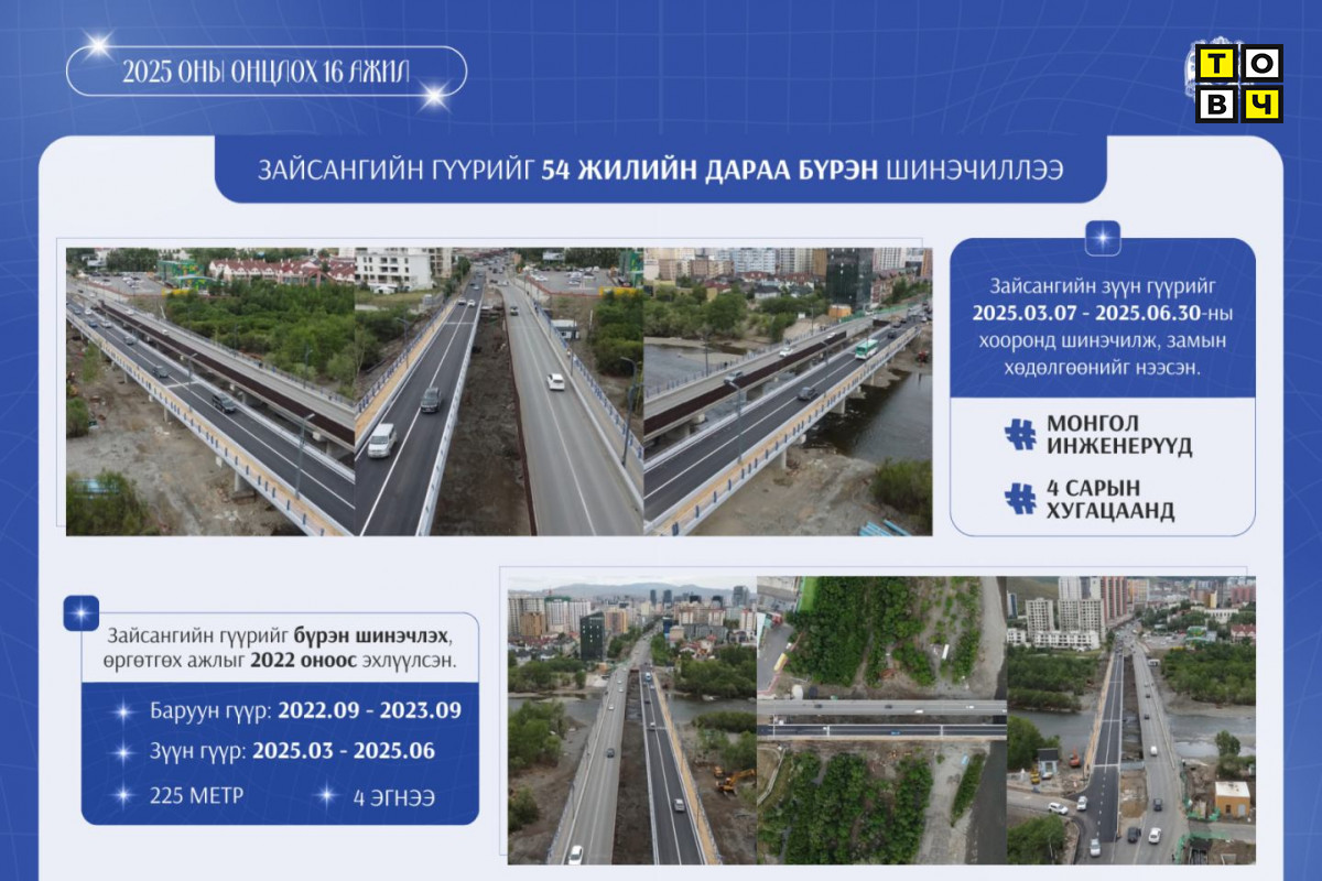Энэ онд Зайсангийн зүүн гүүрийг өргөтгөж шинэчлэх ажлыг үндэсний бүтээн байгуулагчид, монгол инженерүүд дөрвөн сарын хугацаанд хийж гүйцэтгэлээ. Энэ оны нэгдүгээр сарын 10-наас авто замын хөдөлгөөнийг хааж, хуучин гүүрийг буулгаж, гуравдугаар сараас гүүрийг шинэчлэх ажлыг эхлүүлсэн. Шинэ гүүрийг зургаадугаар сарын 30-нд ашиглалтад оруулсан юм. Гүүрийн бүтээн байгуулалтад “ЗМЗ” ХХК буюу үндэсний бүтээн байгуулагч аж ахуйн нэгж шалгарч, дотоодын чадварлаг инженер, техникийн ажилчид ажилласан. Гүүрийг шинэчилж, 225 метр урт хос гүүр барьснаар дөрвөн эгнээ авто замаас ирэх ачааллыг гүүрээр саадгүй нэвтрүүлэх боломж бүрдсэн юм.