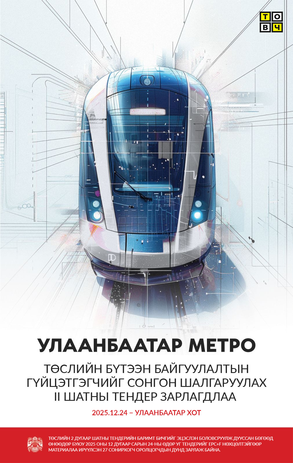 Улаанбаатар метро төслийн бүтээн байгуулалтын EPC гүйцэтгэгчийг сонгон шалгаруулах I шатны тендерийг 2024 оны аравдугаар сард зарлаж, 2025 оны дөрөвдүгээр сард нээсэн. Тус тендерт Их Британи, ОХУ, Франц, Энэтхэг, БНХАУ, Монгол, БНСУ-ын 27 оролцогч байгууллага материал ирүүлж, сонирхлоо илэрхийлсэн. Тэгвэл Улаанбаатар метроны бүтээн байгуулалтын гүйцэтгэгчийг сонгон шалгаруулах II шатны тендерийн баримт бичгийг эцэслэн боловсруулж дууслаа. Өнөөдөр уг тендерийг EPC+F нөхцөлөөр материалаа ирүүлсэн 27 оролцогчийн дунд зарлаж байна. Төслийн II шатны тендерийг хоёр багцтай зарлалаа. Тодруулбал, “Багц I”-ийн төсөвт өртөг 6.6 их наяд төгрөг байна. Үүнээс гүйцэтгэгч төсөвт өртгийн 85 хувийг санхүүжүүлэх саналыг тендерийн хамт хүргүүлэх бөгөөд 15 хувийг нийслэлийн төсвөөс санхүүжүүлнэ. Төслийн “Багц II”-ын тендерийг 2026 оны IV улиралд зарлана.