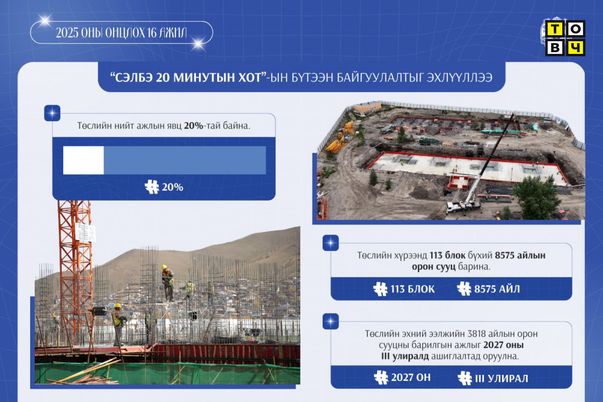 Энэ оны гуравдугаар сард эхний ээлжийн 3818 айлын орон сууц барих гүйцэтгэгчийг сонгон шалгаруулах тендер зарлаж, тавдугаар сарын 29-нд бүтээн байгуулалтыг эхлүүлсэн. Мөн есдүгээр сард дараагийн ээлжийн 67 блок орон сууц барих ажил эхэлсэн. Хүйтний улиралд ч барилгын ажлыг явуулж болдог битүүмжлэх технологийг ашиглаж, төлөвлөгөөний дагуу барилга угсралтын ажлыг тасралтгүй үргэлжлүүлснээр багцуудын бэлтгэл ажил 99 хүртэлх хувийн биелэлттэй байна. Нийт 113 блокоос 82 блокийн суурийн ажлыг эхлүүлсэн. Зоорийн давхар болон нэг, хоёрдугаар давхрын арматур угсрах ажлыг хэсэгчлэн гүйцэтгэж байна.