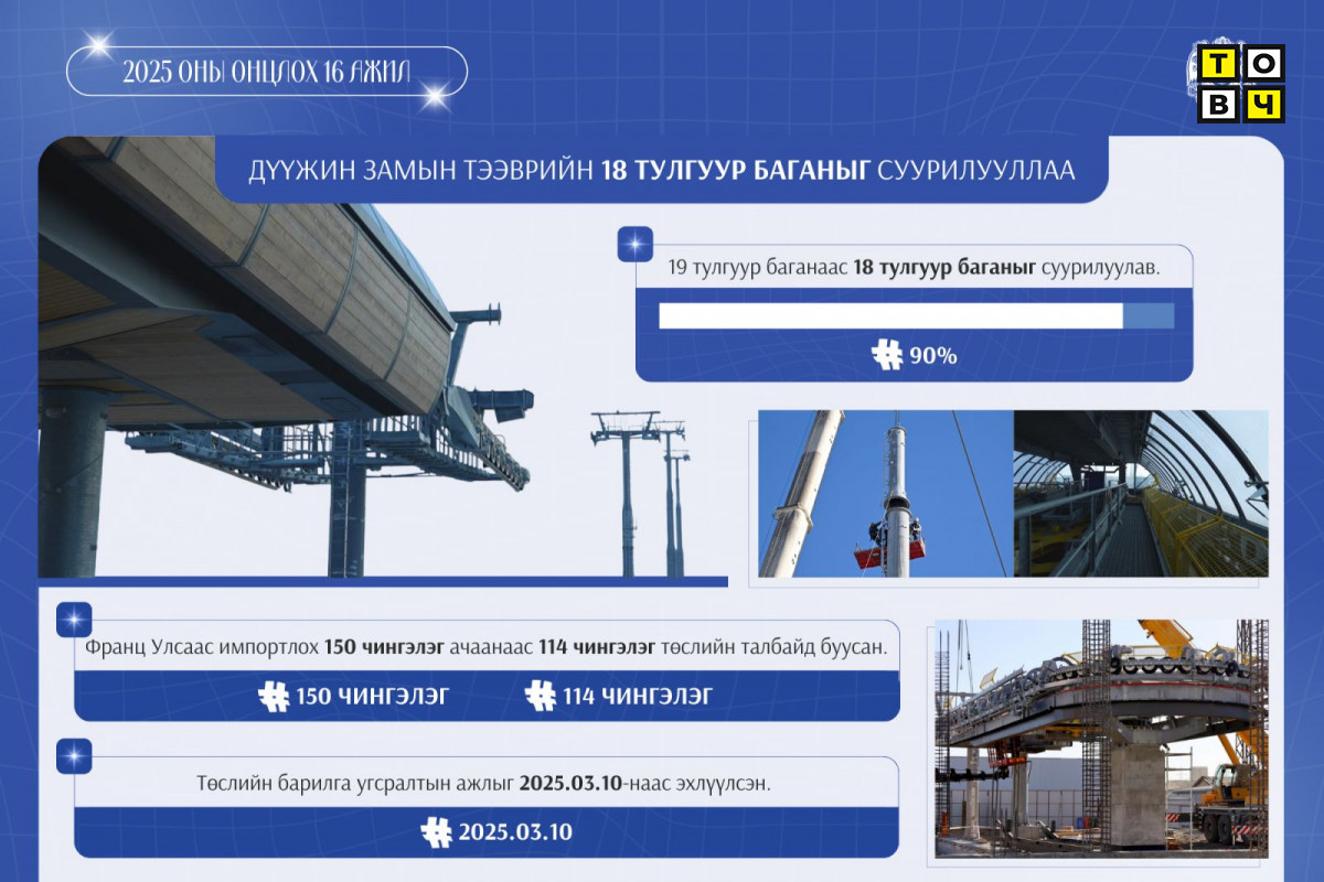 Тус бүтээн байгуулалтын бэлтгэл ажлыг бүрэн хангаж, барилга угсралтын ажлыг 2025 оны гуравдугаар сарын 10-ны өдөр эхлүүлсэн. Өнөөдрийн байдлаар төслийн нийт ажил 54 хувьтай үргэлжилж байна. Дүүжин замын тээврийн 19 тулгуур багана суурилуулахаас 18 тулгуур баганыг суурилуулж, хоёр буудлын барилгын ажлыг гүйцэтгэж байна. Мөн 98 ширхэг кабины гараашийн барилга угсралтын ажлыг эхлүүллээ. Энэ өвөл дүүжин замын тээврийн ажил зогсолтгүй үргэлжилнэ. 2025 оны долоодугаар сарын 8-нд Дүүжин замын тээврийн үйл ажиллагааг хариуцах байгууллага “Улаанбаатар кабель кар” ОНӨТҮГ-ыг байгуулж, зорчигч тээврийн үйл ажиллагааны бэлтгэл ажлыг хангасан. Уг төслийн хоёрдугаар шугамыг “Үндэсний цэцэрлэгт хүрээлэн-Үндэсний соёл амралтын хүрээлэн” чиглэлд 2.7 км урттай, гурван зогсоолтойгоор төлөвлөж байна.