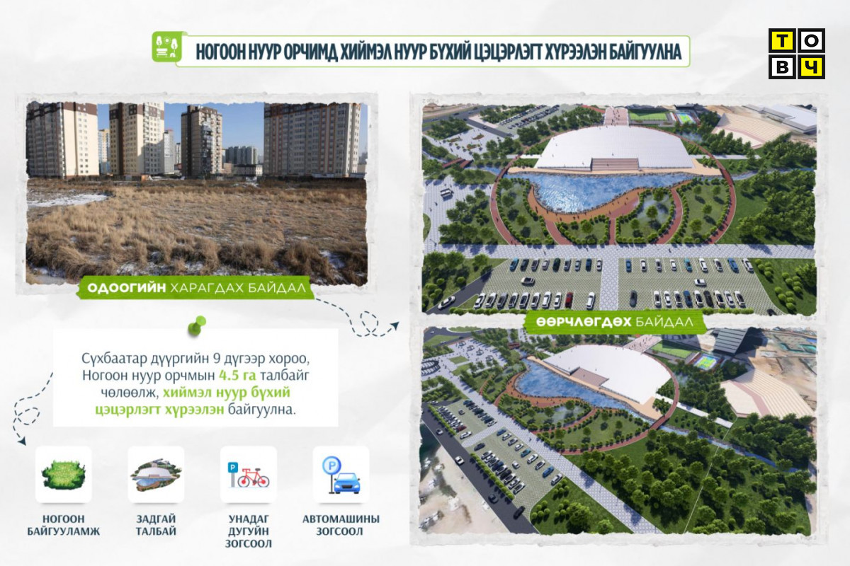 Тухайлбал, Сүхбаатар дүүргийн 9, 10, 11 дүгээр хороонд хүн ам олноор нэмэгдэж, шинэ суурьшлын бүс үүссэн. Тиймээс “20 минутын хот” төлөвлөлтийн хүрээнд ээлтэй, хүртээмжтэй бүс болгох төлөвлөлт хийгээд байна. Энэ хүрээнд Ногоон нуур орчимд 4.5 га талбайг чөлөөлж, хиймэл нуур бүхий цэцэрлэгт хүрээлэн байгуулна. Тус цэцэрлэгт хүрээлэнд ногоон байгууламж, задгай талбай, унадаг дугуй, автомашины зогсоол зэргийг төлөвлөөд буй.