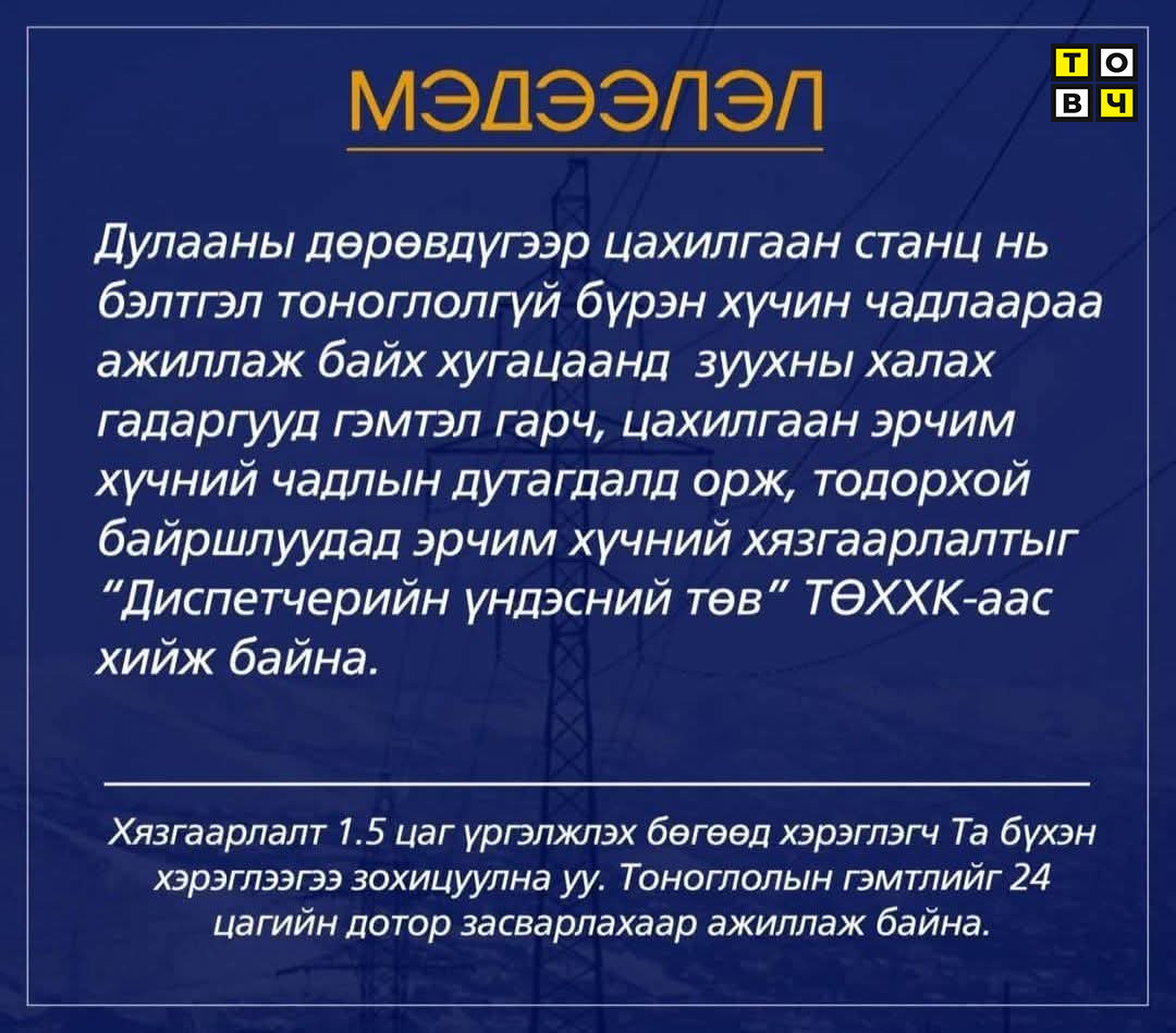 Тодруулбал, эрчим хүчний системийн тасралтгүй, найдвартай байдлыг хангахын тулд дараах цагуудад зайлшгүй шаардлагатай бус цахилгаан хэрэгслүүдээ унтрааж, тогоо тохируулахыг иргэд, аж ахуйн нэгжүүдэд уриалав.