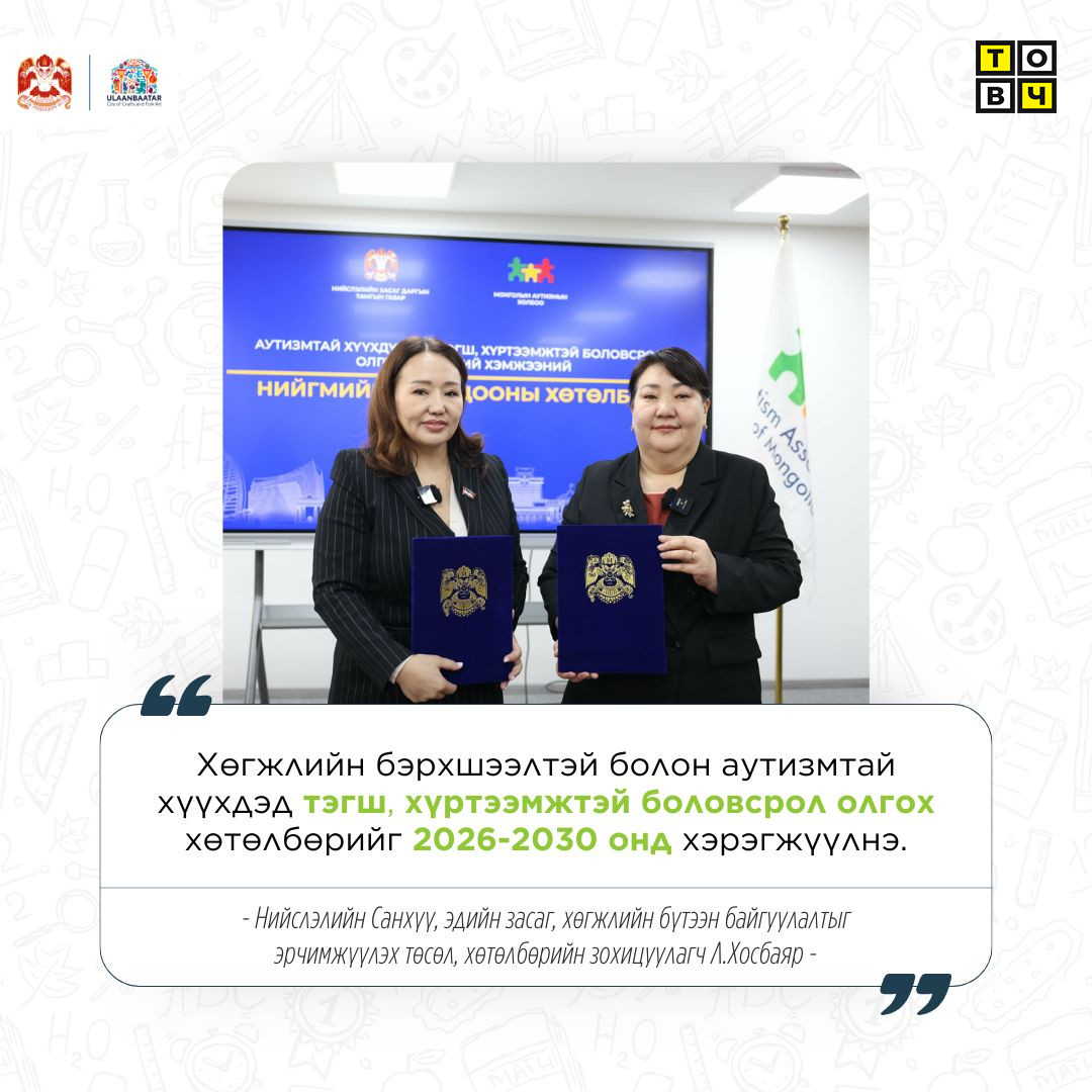 Манай улсад ч мөн энэ хүрээний эмгэгтэй хүүхдэд ээлтэй, хүлээн зөвшөөрөгдсөн, хүртээмжтэй боловсролын болон нийгмийн тогтолцоо дутмаг. Иймээс хөгжлийн бэрхшээлтэй болон аутизмтай хүүхдэд тэгш, хүртээмжтэй боловсрол олгох хөтөлбөрийг 2026-2030 онд хэрэгжүүлэхээр нийслэлийн Санхүү, эдийн засаг, хөгжлийн бүтээн байгуулалтыг эрчимжүүлэх төсөл, хөтөлбөрийн зохицуулагч Л.Хосбаяр болон Монголын аутизмын холбооны НҮТББ-ын зөвлөх Л.Алтангэрэл нар хамтын ажиллагааны санамж бичиг байгууллаа. Ингэснээр олон улсын тэр дундаа Япон улсын хөгжлийн бэрхшээлтэй болон аутизмтай хүүхэдтэй харилцах, хөгжүүлэх туршлагыг судлан, боловсролын байгууллагад болон нийгэмд үе шаттайгаар нутагшуулах боломжтой боллоо.