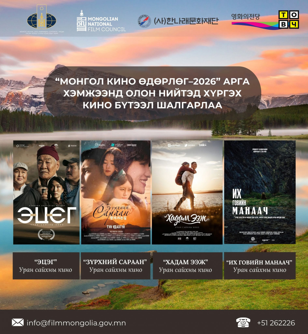 “Монгол кино өдөрлөг–2026” арга хэмжээнд олон нийтэд хүргэх үзвэрийн хэсэгт кино бүтээлийн сонгон шалгаруулалтад нийт 15 кино бүтээл ирүүлснээс Кино урлагийн зөвлөлийн шийдвэрээр дараах кино уран бүтээлүүдийг шалгаруулсан байна. Үүнд,
