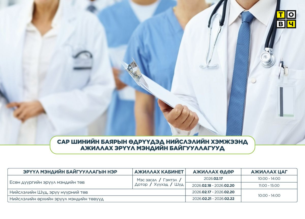 XVII жарны “Сүрээр дарагч” хэмээх гал морин жилийн сар шинийн баярын өдрүүд маргааш эхэлнэ. Тэгвэл эл өдрүүдэд нийслэлийн хэмжээнд ажиллах эрүүл мэндийн байгууллагуудыг хүргэж байна. Тухайлбал, 9 дүүргийн эрүүл мэндийн төвүүд 10-15 цагийн хооронд ажиллана.