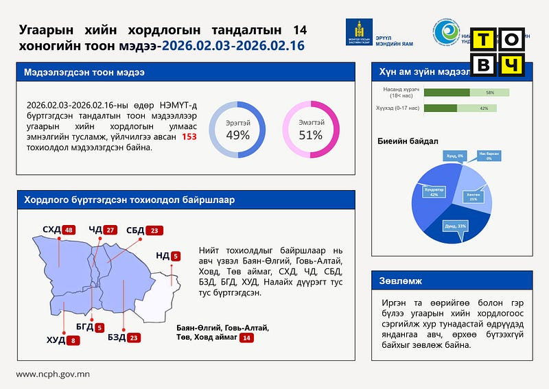 Өнгөрсөн 14 хоногийн хугацаанд  хоёрдугаар сарын 3-16-ны хооронд  153 иргэн  угаарын хийд хордож, эмнэлгийн тусламж үйлчилгээ авсан байна.