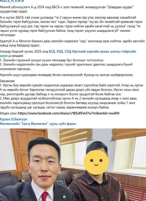 Иргэн А гурван жилийн өмнө бичиг баримтаа алджээ. Улмаар 2024 онд түүний гар утсанд ББСБ-аас зээлээ төлөхийг шаардсан мессэж иржээ. Иргэн А Т тухайн ББСБ-тай өөрийн биеэр очиж уулзахад гар утасны зээлийн гэрээ хийснийг дурджээ. Харин зээлийн гэрээтэй танилцах хүсэлт гаргасан ч түүнд гэрээг танилцуулаагүй байна. Иргэн А-ийн бичиг баримтыг олсон иргэн Б-нь ББСБ-аас бичиг баримтыг нь ашиглан “iphone 15 promax” гар утсыг зээлээр авч 10 орчим сая төгрөгийн хохирол учруулахын зэрэгцээ, хар жагсаалтад оруулжээ.