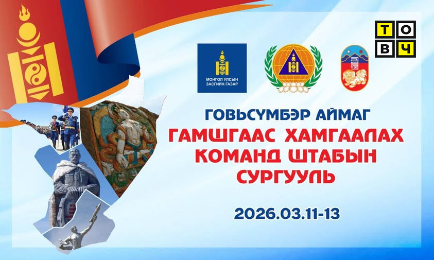 Монгол Улсын Шадар Сайдын 2025 онд баталсан "Аймаг, нийслэлд гамшгаас хамгаалах команд штабын сургууль зохион байгуулах хуваарь, төлөвлөгөө"-ний хэрэгжилтийг хангах хүрээнд Говьсүмбэр аймагт 2026 оны 03 дугаар сарын 11-13-ны өдрүүдэд "Гамшгаас хамгаалах команд штабын сургууль" зохион байгуулахаар төлөвлөгдсөн.