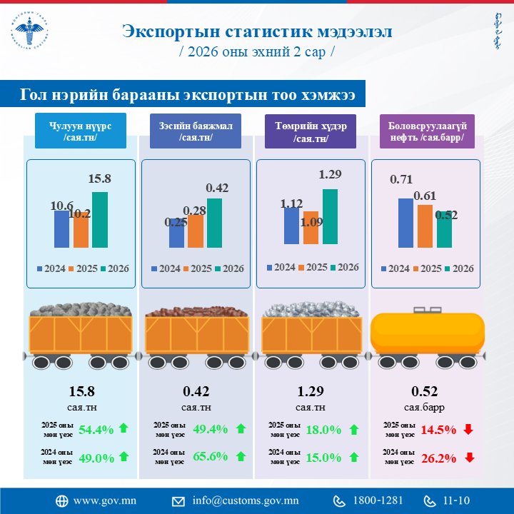Экспортын гол нэрийн бүтээгдэхүүнээс чулуун нүүрс энэ оны хоёрдугаар сарын байдлаар 15.8 сая тонн-д хүрч, өмнөх оны мөн үеэс 54.4 хувиар өсжээ. Мөн зэсийн баяжмал экспорт 0.42 сая тонн болж, 2025 оны мөн үетэй харьцуулахад 49.4 хувиар, төмрийн хүдэр, баяжмал экспорт 1.29 сая тонн болж, өмнөх оны мөн үеэс 18.0 хувиар тус тус өссөн дүн гарчээ.